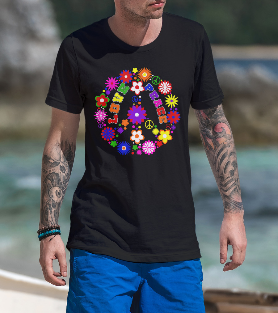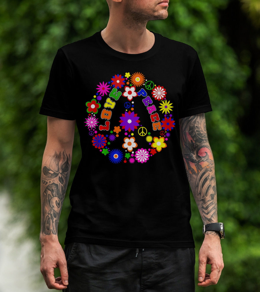 The Love Peace Sign Retro Flowers Hippie Col Colorful Groovy T-shirt is designed for everyday wear and a consistent fit. Fabric is pre-shrunk ring-spun cotton with durable stitching. See the size chart below for exact measurements.