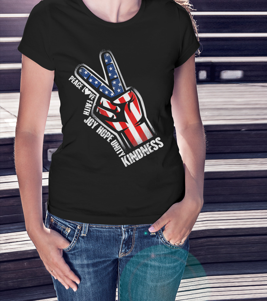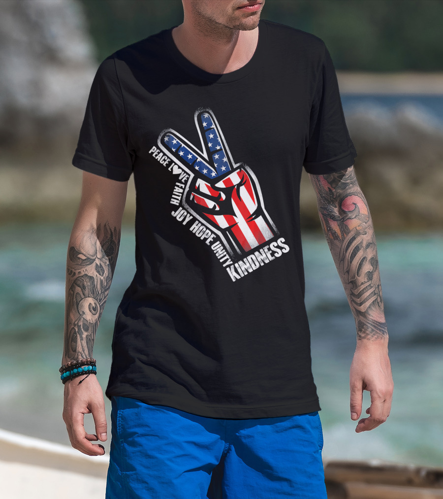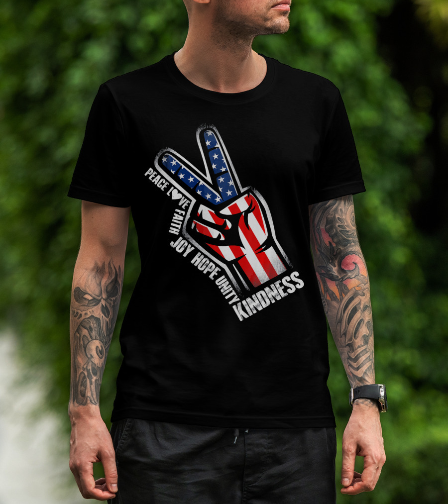 The UNITY DAY Peace Love Faith Joy Hope Unity Kindness Hand T-shirt is designed for everyday wear and a consistent fit. Fabric is pre-shrunk ring-spun cotton with durable stitching. See the size chart below for exact measurements.