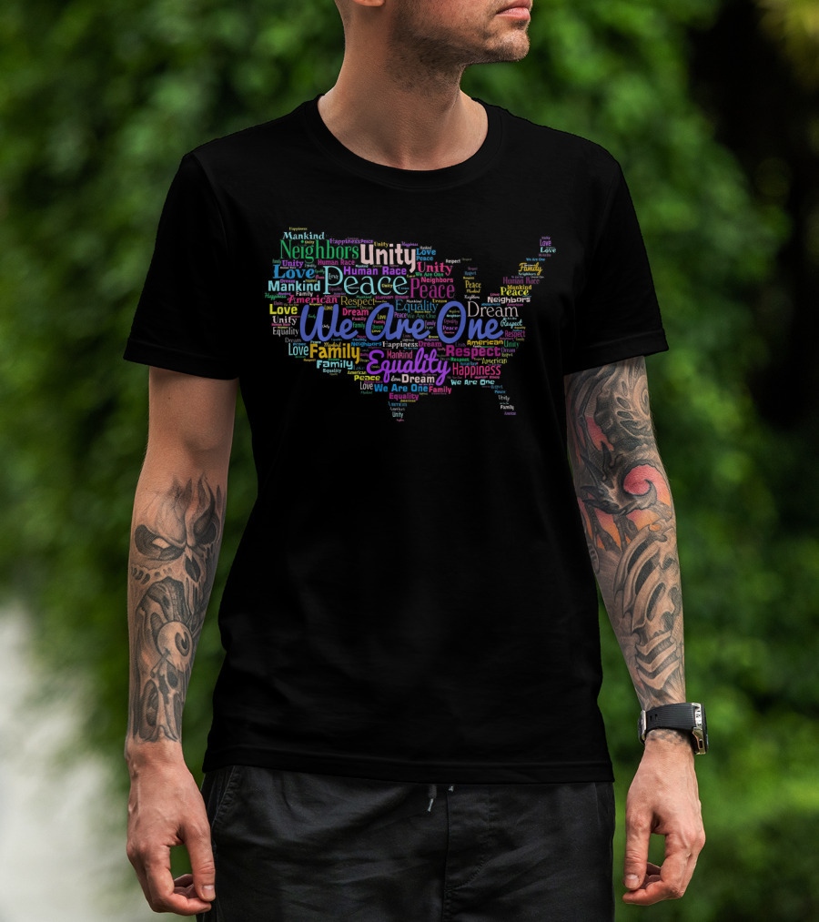 The We Are One Unity Equality Peace Love Family Respect Neighbors Happiness Human Race Mankind T-shirt is designed for everyday wear and a consistent fit. Fabric is pre-shrunk ring-spun cotton with durable stitching. See the size chart below for exact measurements.