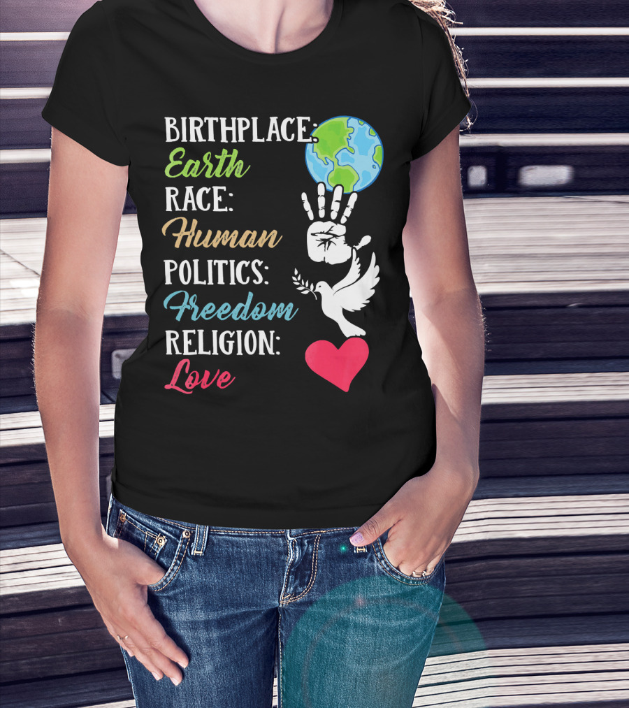 Birthplace Earth Race Human Politics Freedom Religion Love Heart Dove Handprint Earth T-Shirt