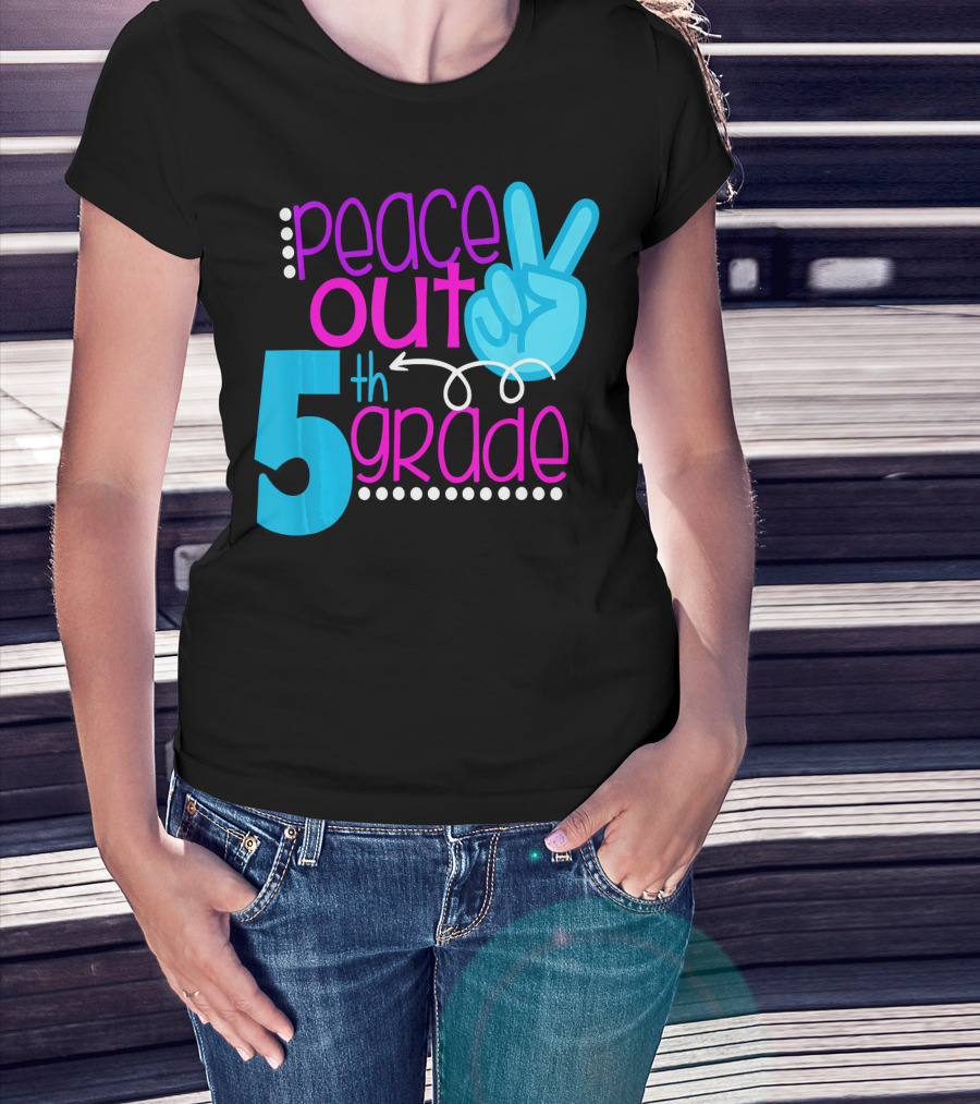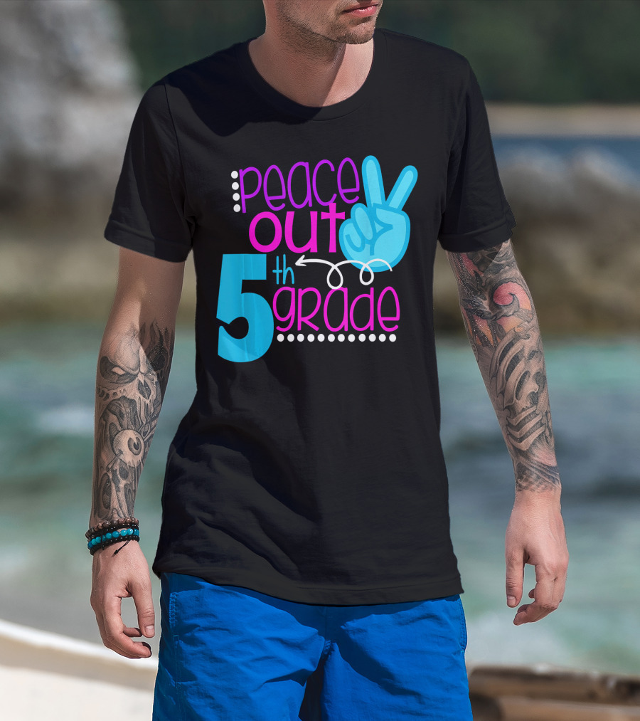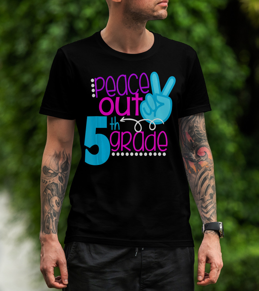 The Peace Out 5th Grade First Day of School T-shirt is designed for everyday wear and a consistent fit. Fabric is pre-shrunk ring-spun cotton with durable stitching. See the size chart below for exact measurements.