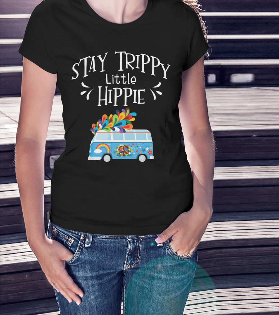 Stay Trippy Little Hippie Colorful Van With Peace And Rainbow Symbols T-Shirt