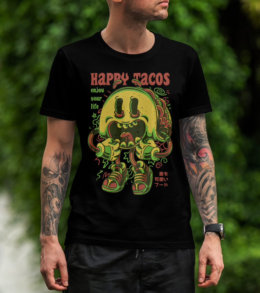 The Happy Tacos Enjoy Your Life Funny Taco Japanese Anime Most Cute Food T-shirt is designed for everyday wear and a consistent fit. Fabric is pre-shrunk ring-spun cotton with durable stitching. See the size chart below for exact measurements.