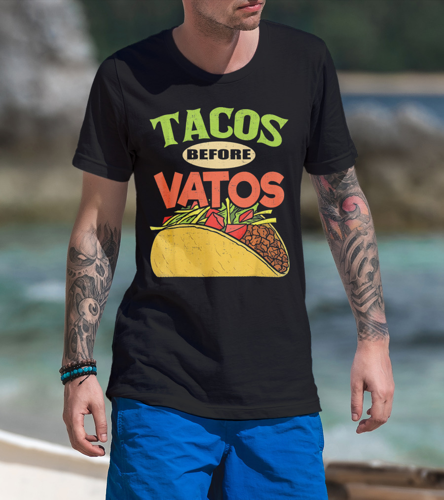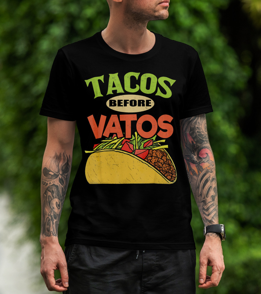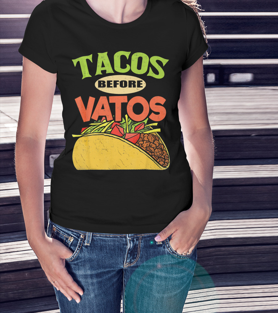 The Tacos Before Vatos Funny Taco T-shirt is designed for everyday wear and a consistent fit. Fabric is pre-shrunk ring-spun cotton with durable stitching. See the size chart below for exact measurements.