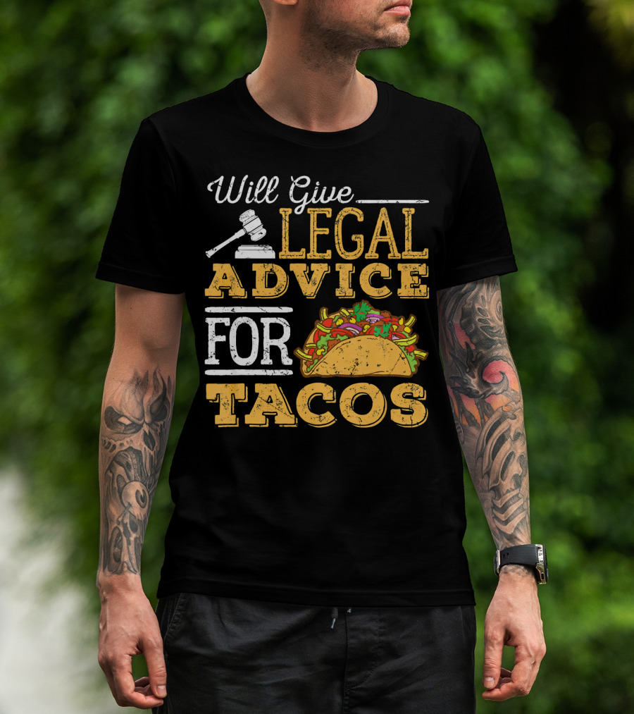 The Will Give Legal Advice for Tacos T-shirt is designed for everyday wear and a consistent fit. Fabric is pre-shrunk ring-spun cotton with durable stitching. See the size chart below for exact measurements.