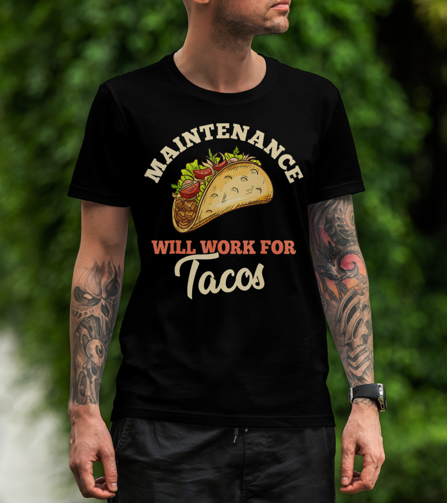 The Maintenance Will Work for Tacos T-shirt is designed for everyday wear and a consistent fit. Fabric is pre-shrunk ring-spun cotton with durable stitching. See the size chart below for exact measurements.
