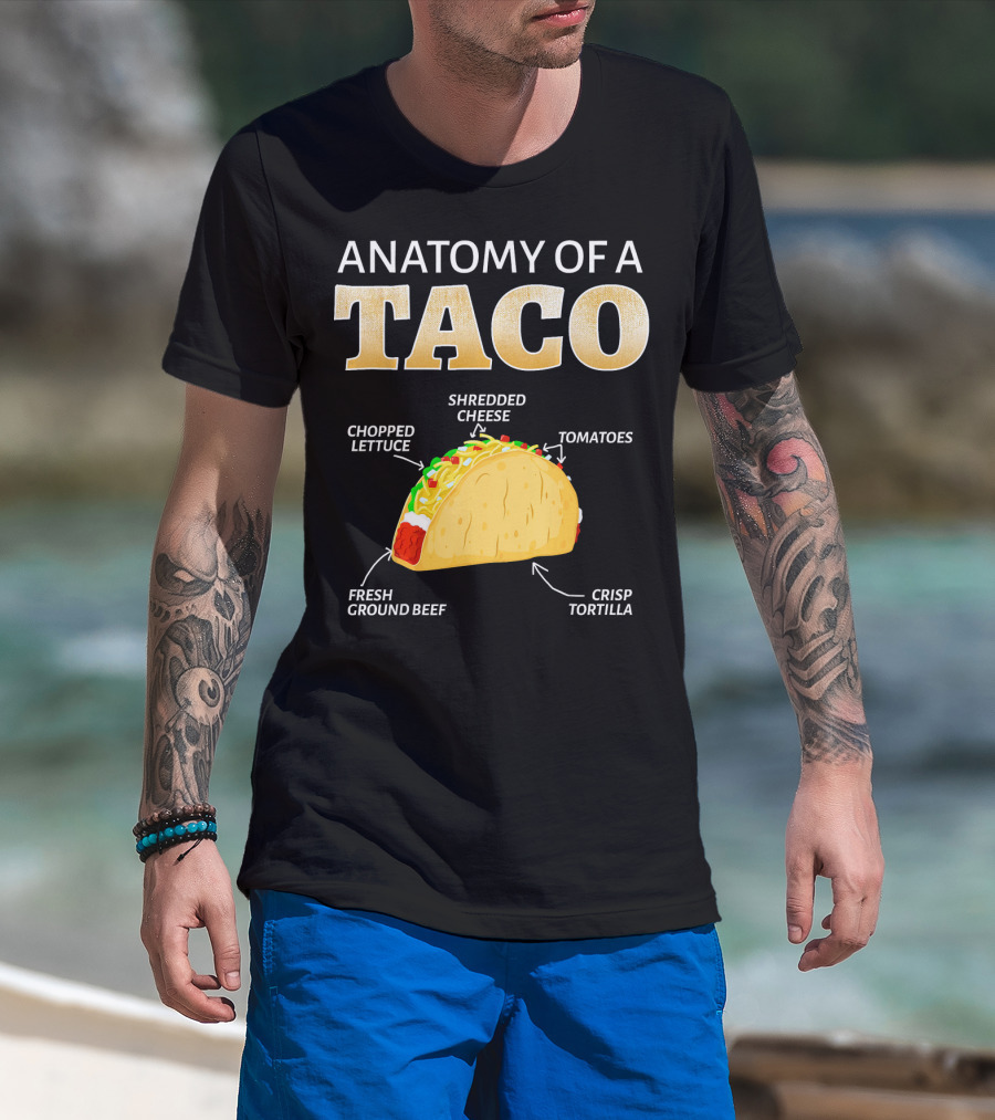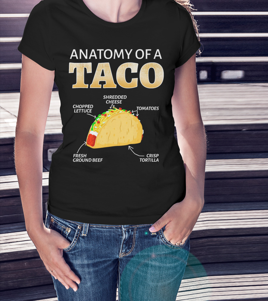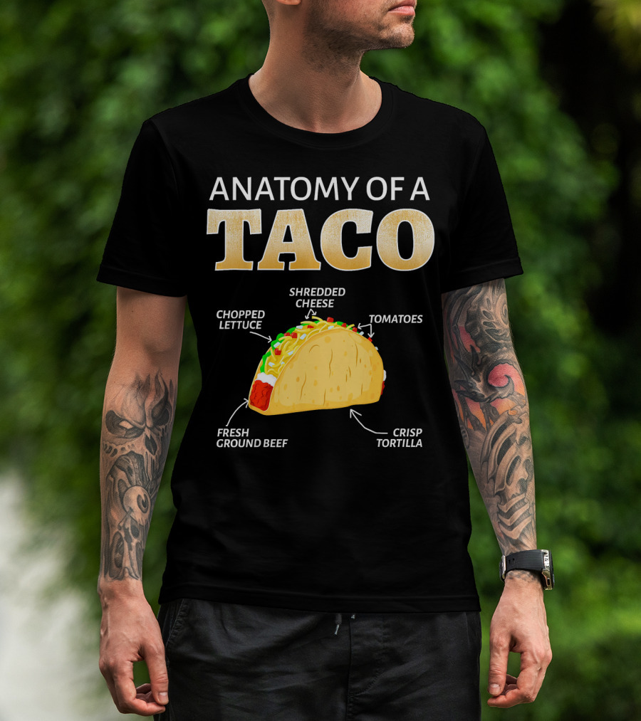 The ANATOMY OF A TACO TACO LOVER CHOPPED LETTUCE SHREDDED CHEESE TOMATOES FRESH GROUND BEEF CRISP TORTILLA T-shirt is designed for everyday wear and a consistent fit. Fabric is pre-shrunk ring-spun cotton with durable stitching. See the size chart below for exact measurements.