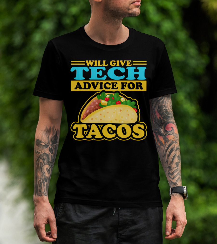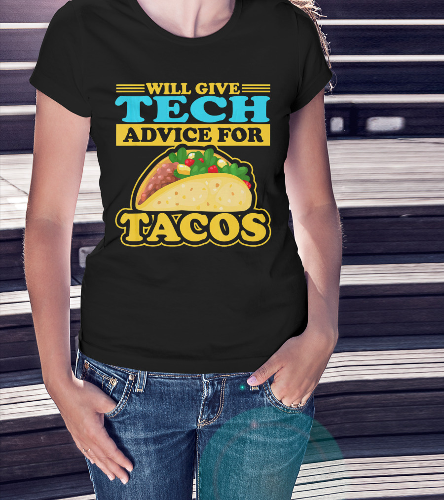 The Will Give Tech Advice for Tacos T-shirt is designed for everyday wear and a consistent fit. Fabric is pre-shrunk ring-spun cotton with durable stitching. See the size chart below for exact measurements.