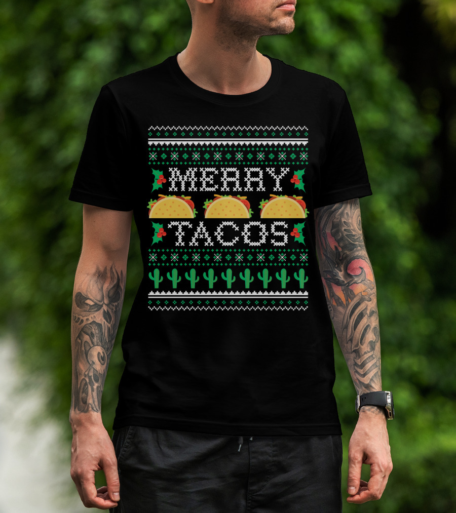 Merry Tacos Ugly Christmas Cactus Holly T-Shirt