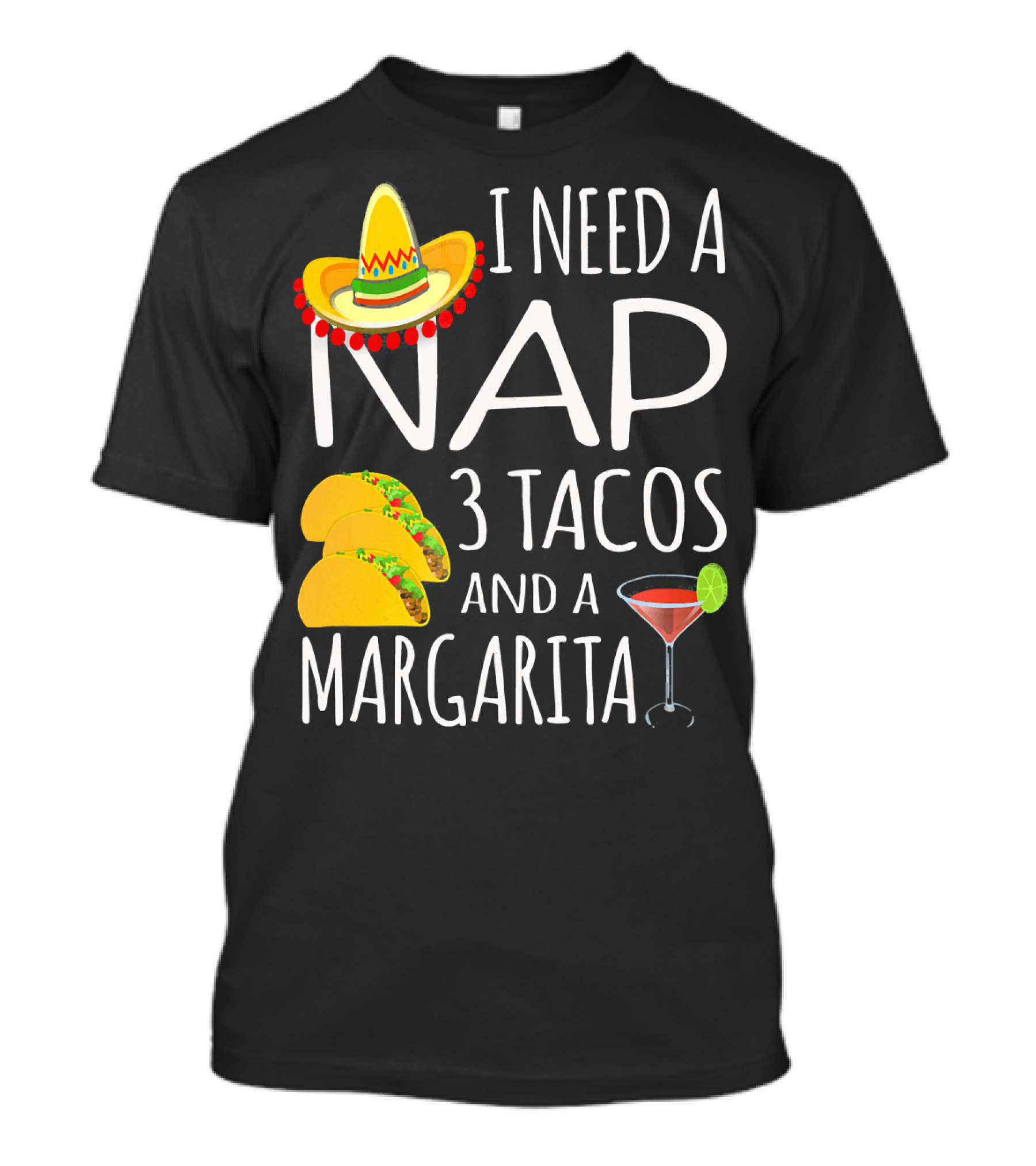 The I Need A Nap 3 Tacos And A Margarita Sombrero and Drink T-shirt is designed for everyday wear and a consistent fit. Fabric is pre-shrunk ring-spun cotton with durable stitching. See the size chart below for exact measurements.