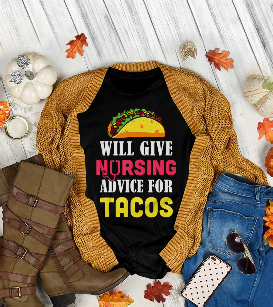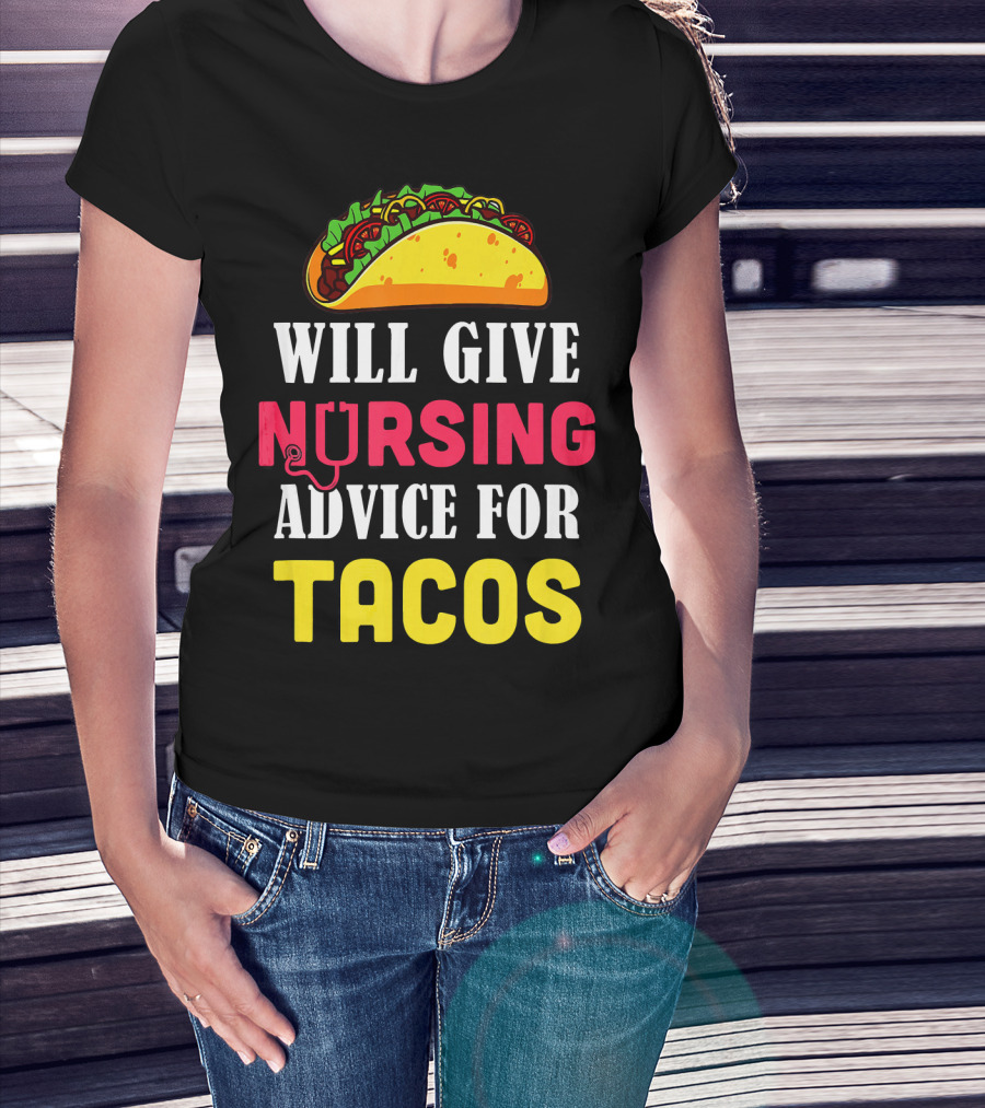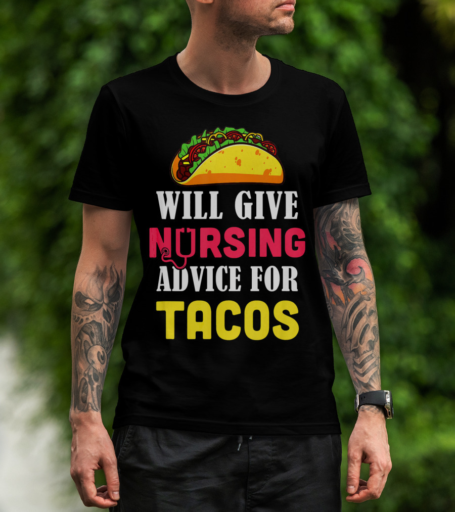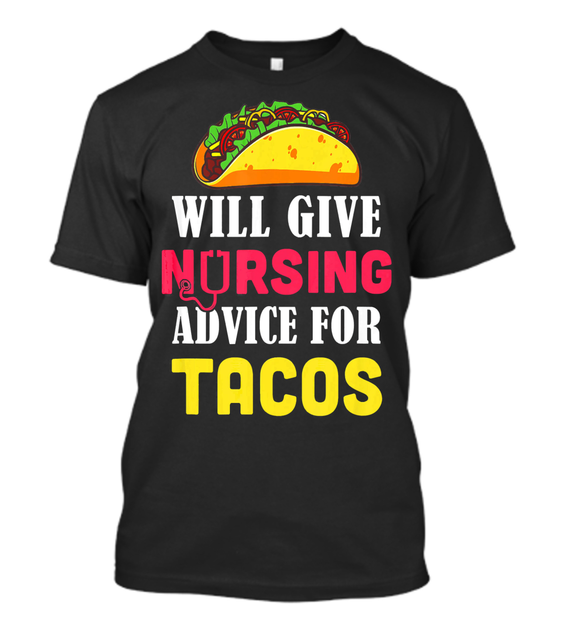 The Will Give Nursing Advice for Tacos T-shirt is designed for everyday wear and a consistent fit. Fabric is pre-shrunk ring-spun cotton with durable stitching. See the size chart below for exact measurements.