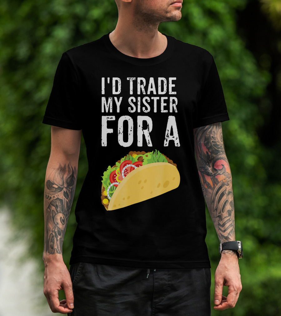 The I'd Trade My Sister For A Taco T-shirt is designed for everyday wear and a consistent fit. Fabric is pre-shrunk ring-spun cotton with durable stitching. See the size chart below for exact measurements.