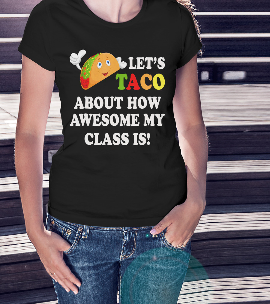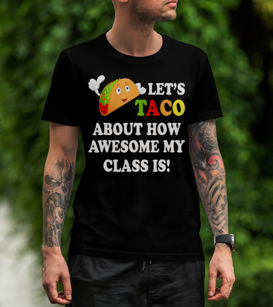 The Let's Taco About How Awesome My Class Is T-shirt is designed for everyday wear and a consistent fit. Fabric is pre-shrunk ring-spun cotton with durable stitching. See the size chart below for exact measurements.