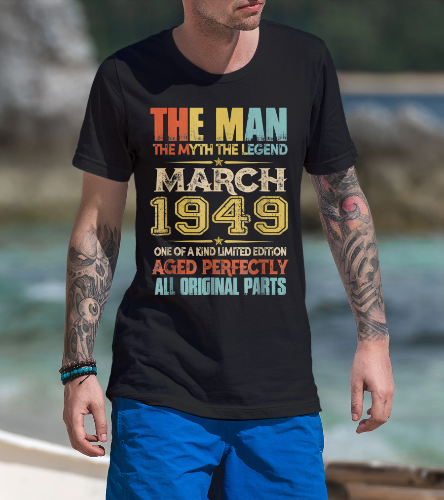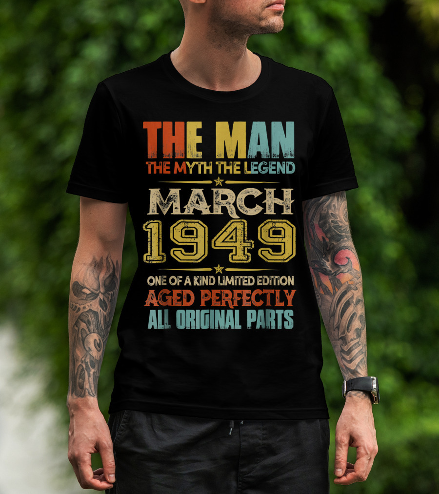 The The Man Myth Legend March 1949 One of a Kind Aged Perfectly All Original Parts T-shirt is designed for everyday wear and a consistent fit. Fabric is pre-shrunk ring-spun cotton with durable stitching. See the size chart below for exact measurements.