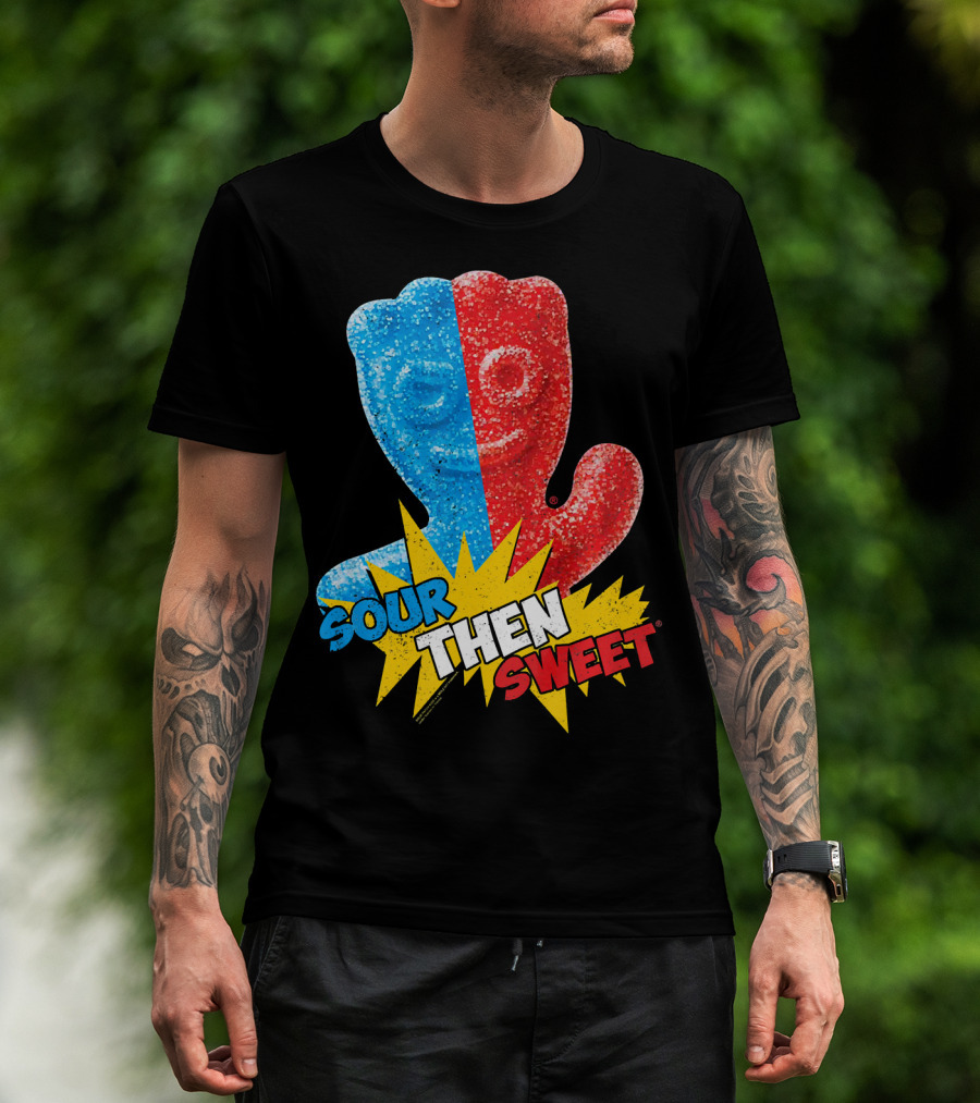 The Sour Patch Kids Sour Then Sweet Candy Blue Red Explosion T-shirt is designed for everyday wear and a consistent fit. Fabric is pre-shrunk ring-spun cotton with durable stitching. See the size chart below for exact measurements.