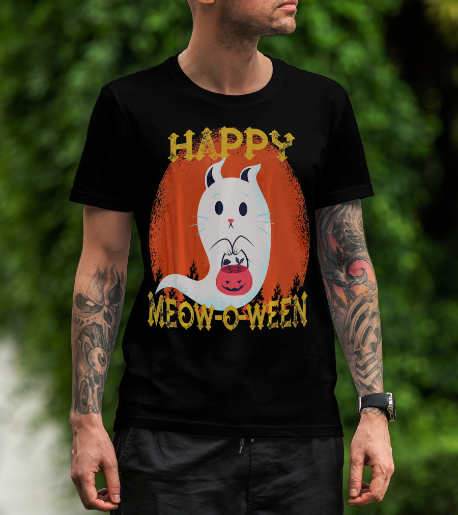 The Happy Meow O Ween Cat Ghost with Pumpkin Bag T-shirt is designed for everyday wear and a consistent fit. Fabric is pre-shrunk ring-spun cotton with durable stitching. See the size chart below for exact measurements.