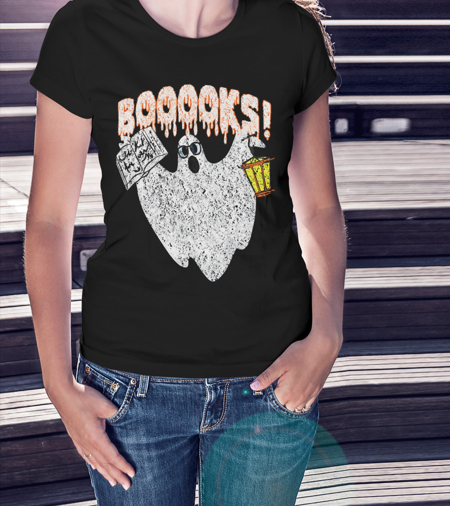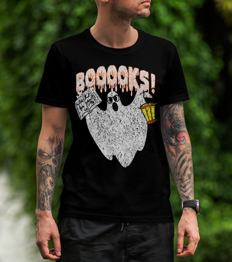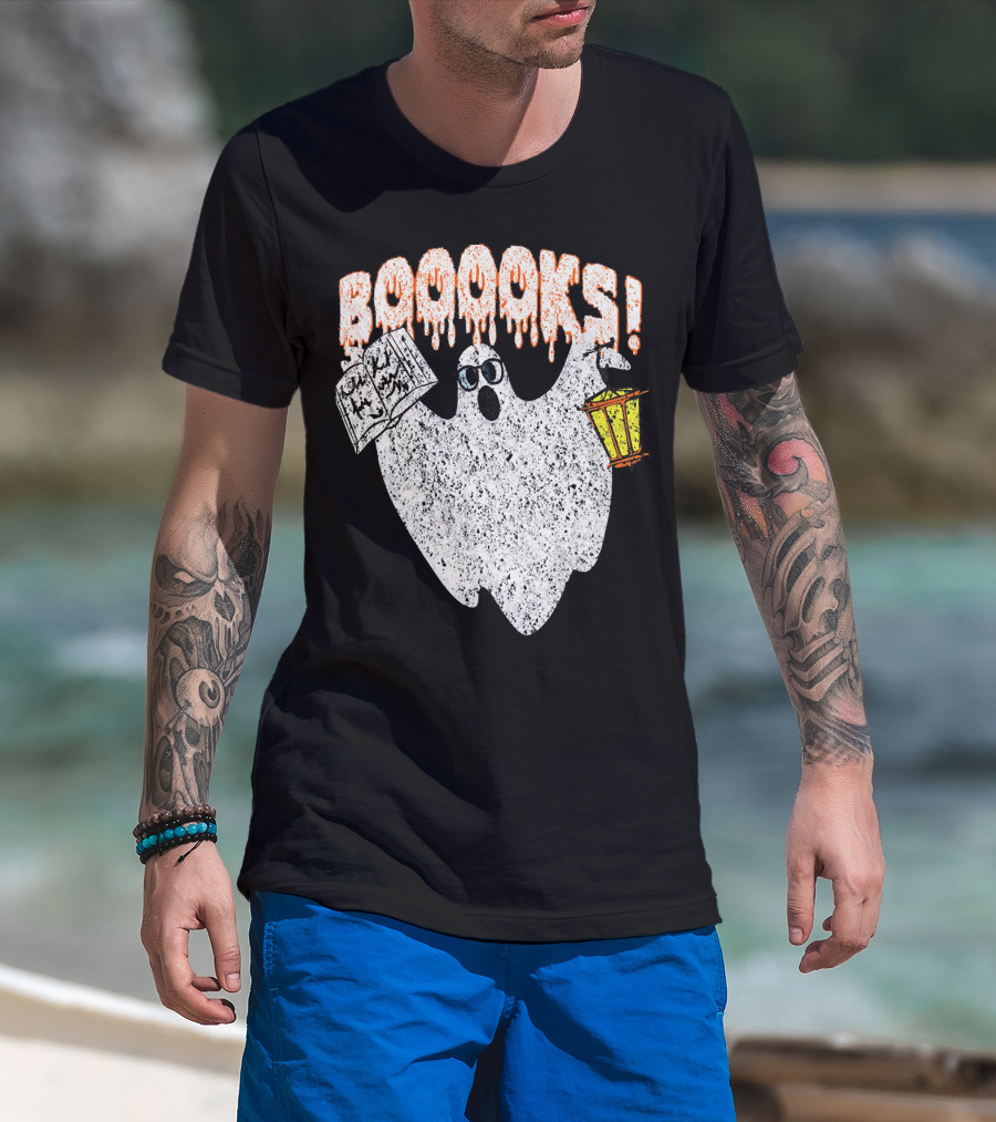The Booooks Spooky Ghost with Open Scary Book and Lantern T-shirt is designed for everyday wear and a consistent fit. Fabric is pre-shrunk ring-spun cotton with durable stitching. See the size chart below for exact measurements.