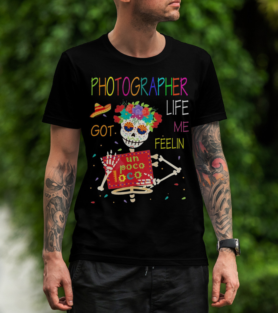 Photographer Life Got Me Feelin Un Poco Loco Skeleton With Sombrero And Flowers T-Shirt
