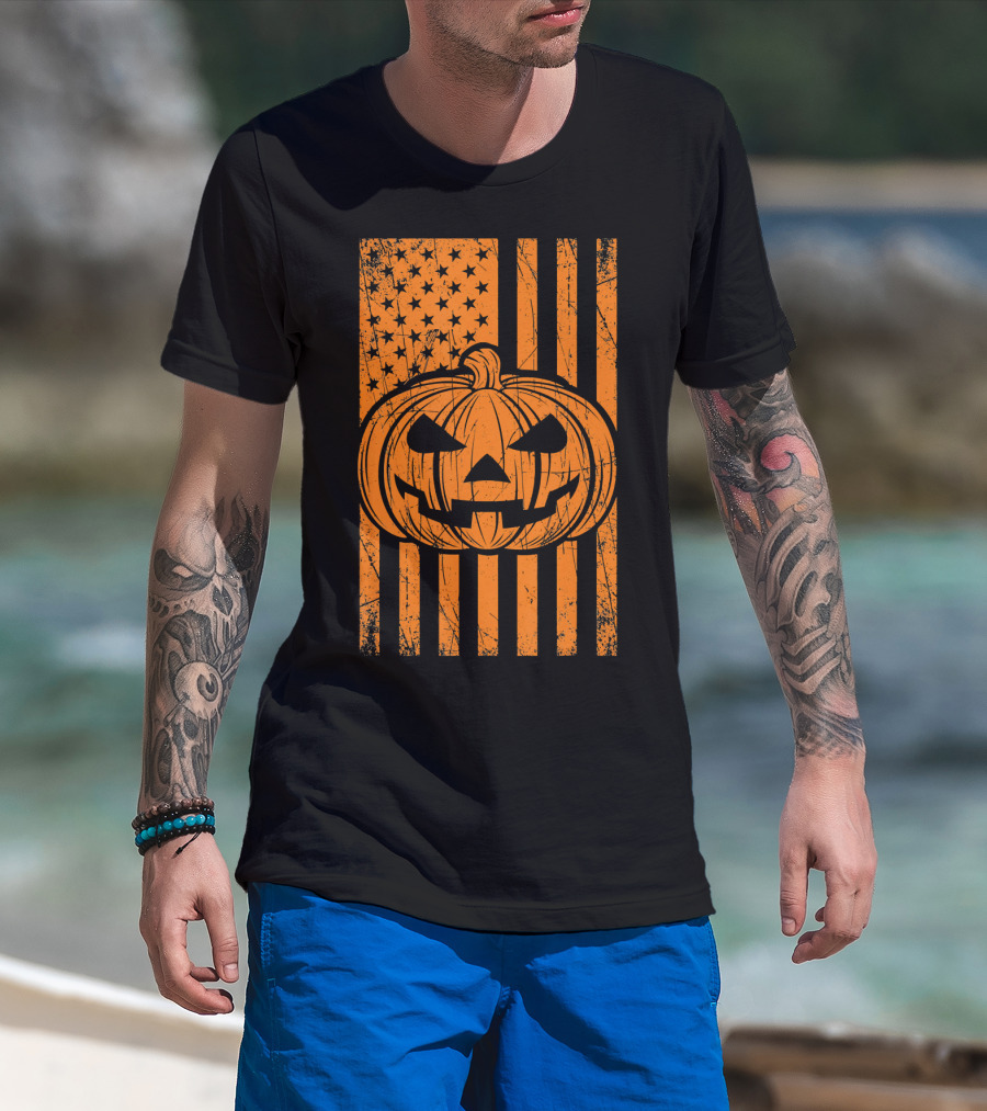 The American Flag Grunge Pumpkin Halloween Las T-shirt is designed for everyday wear and a consistent fit. Fabric is pre-shrunk ring-spun cotton with durable stitching. See the size chart below for exact measurements.