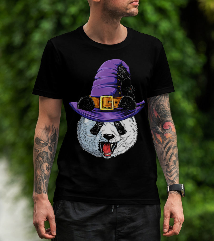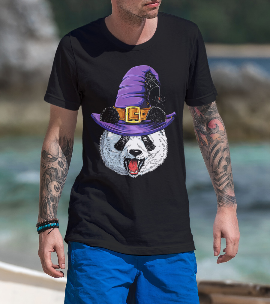 Panda Wearing Witch Hat With Spider Halloween T-Shirt