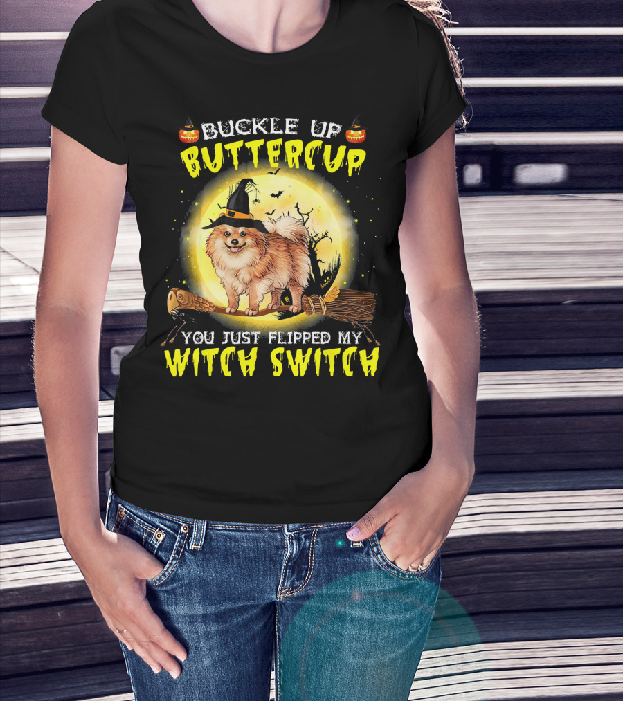 Buckle Up Buttercup You Just Flipped My Witch Switch Pomeranian Dog Broomstick Moon Halloween T-Shirt