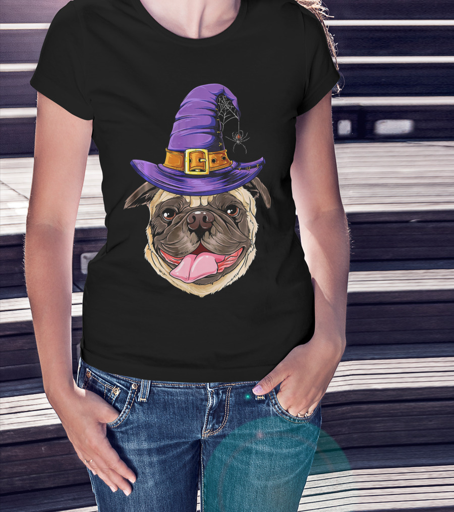 Pug With Witch Hat And Spider Halloween T-Shirt