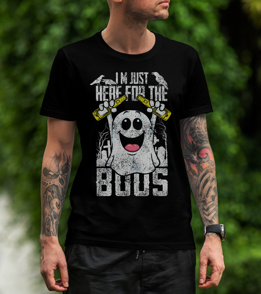I Am Just Here For The Boos With Ghost Holding Bottles And Ravens Halloween T-Shirt
