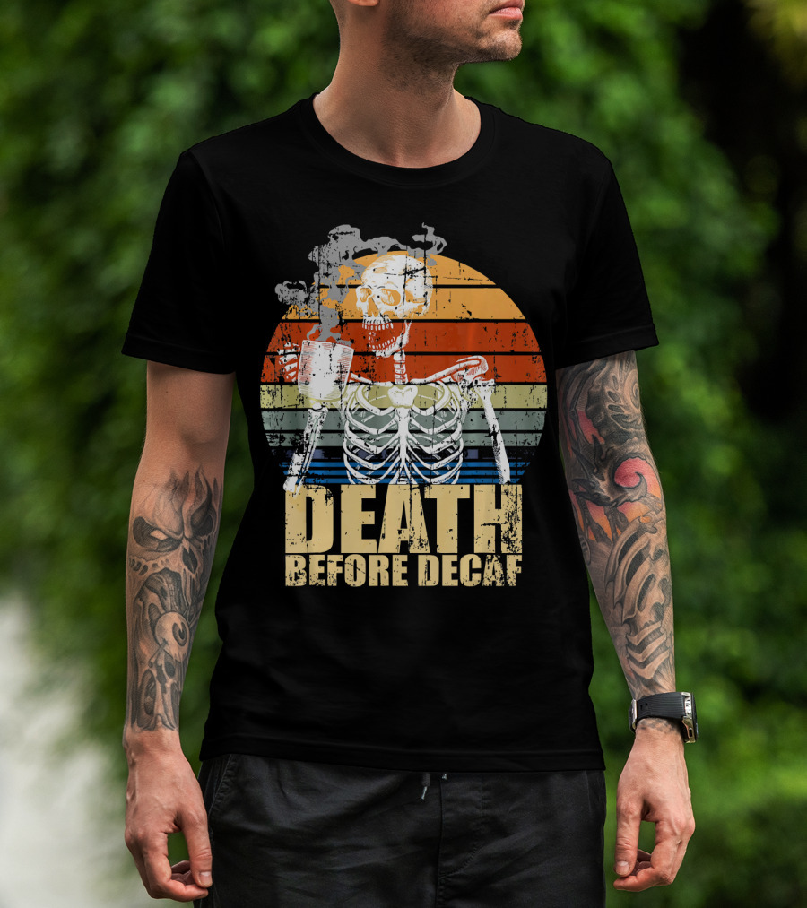 The Vintage Death Before Decaf Coffee Skeleton Retro Sunset T-shirt is designed for everyday wear and a consistent fit. Fabric is pre-shrunk ring-spun cotton with durable stitching. See the size chart below for exact measurements.