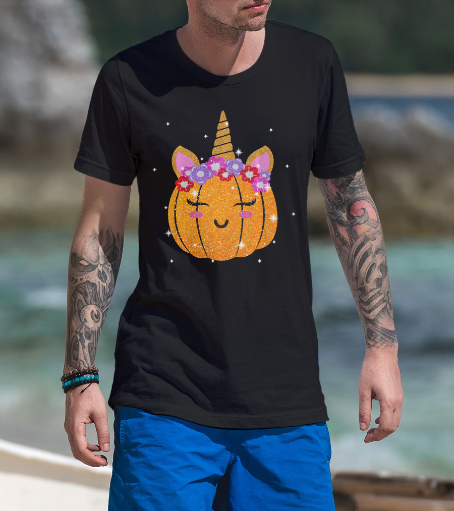 Cute Unicorn Pumpkin Glitter Funny Halloween Sparkles T-Shirt
