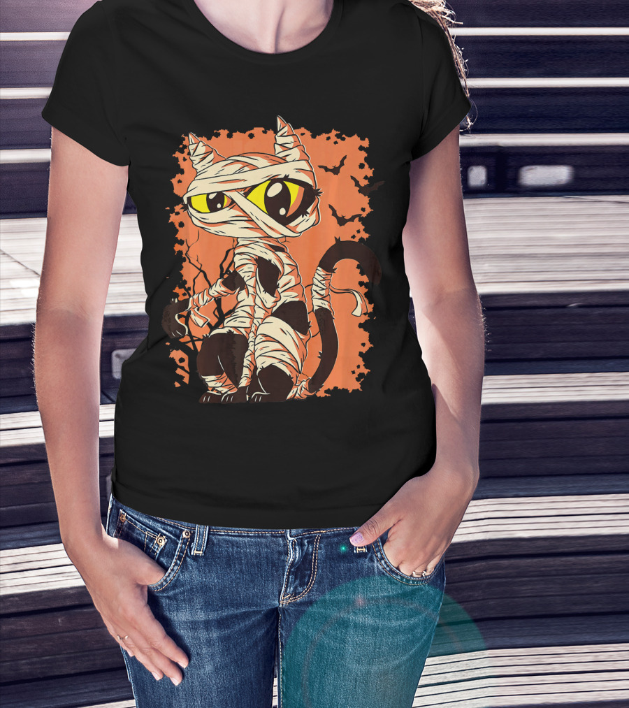 Mummy Cat With Yellow Eyes And Halloween Bats T-Shirt