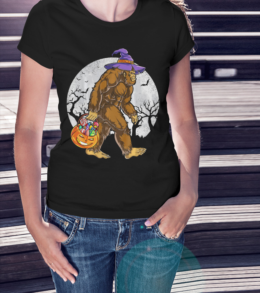Bigfoot Witch Carrying Pumpkin Candy Basket In Spooky Moonlit Forest T-Shirt