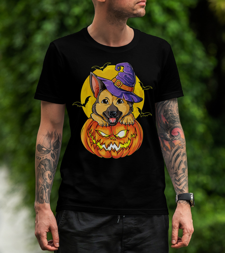 The German Shepherd Pumpkin with Witch Hat and Bats T-shirt is designed for everyday wear and a consistent fit. Fabric is pre-shrunk ring-spun cotton with durable stitching. See the size chart below for exact measurements.