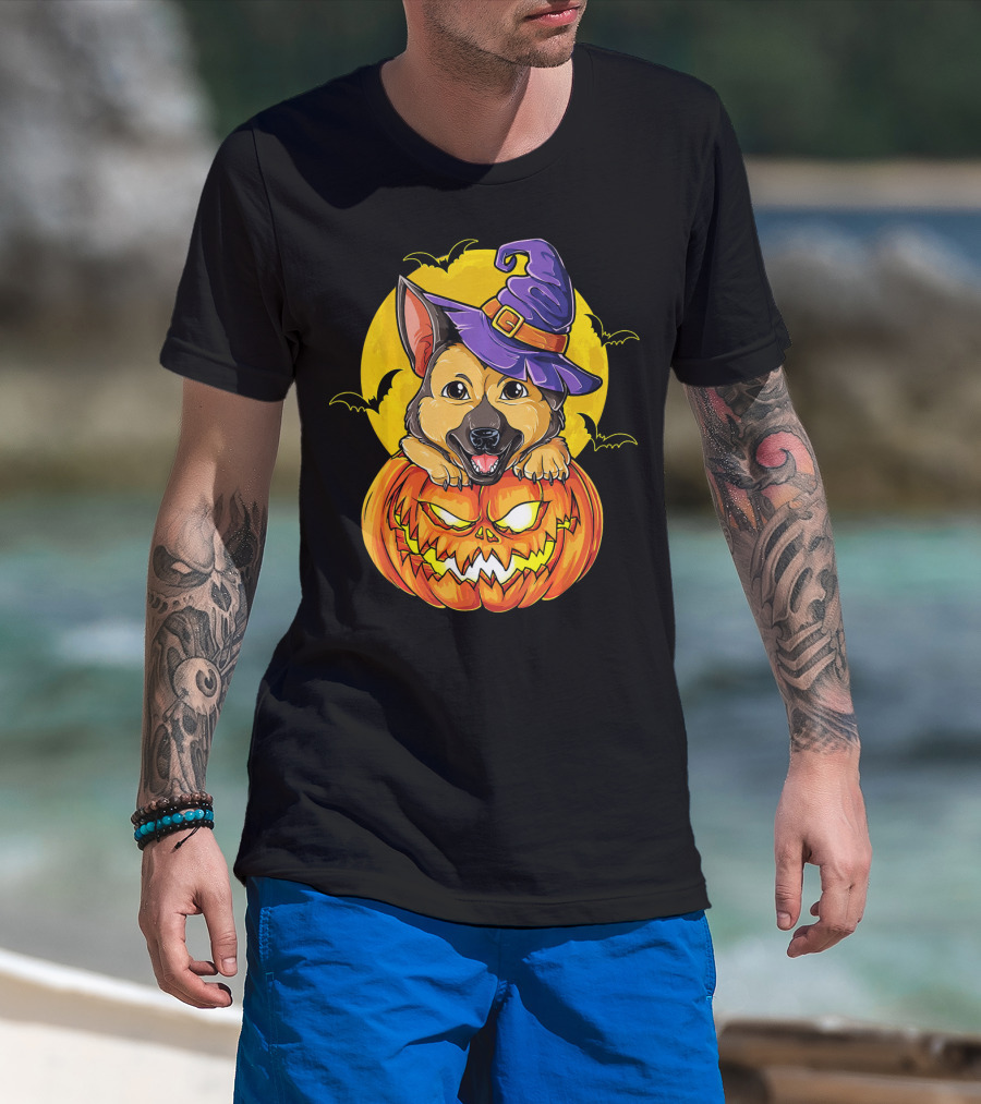 German Shepherd Pumpkin With Witch Hat And Bats T-Shirt