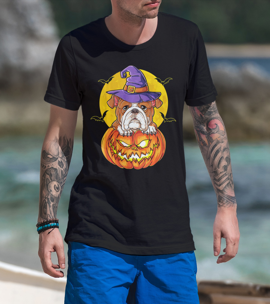 English Bulldog Halloween Witch Pumpkin Moon T-Shirt