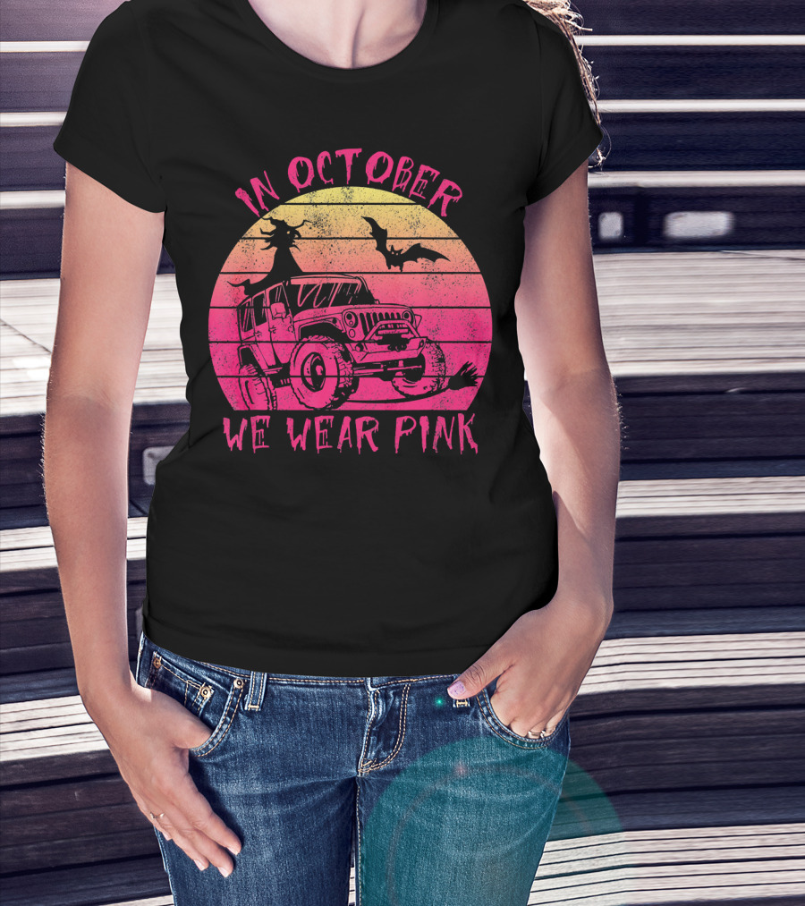 In October We Wear Pink Halloween Jeeps Witch And Bat Vintage Sunset T-Shirt