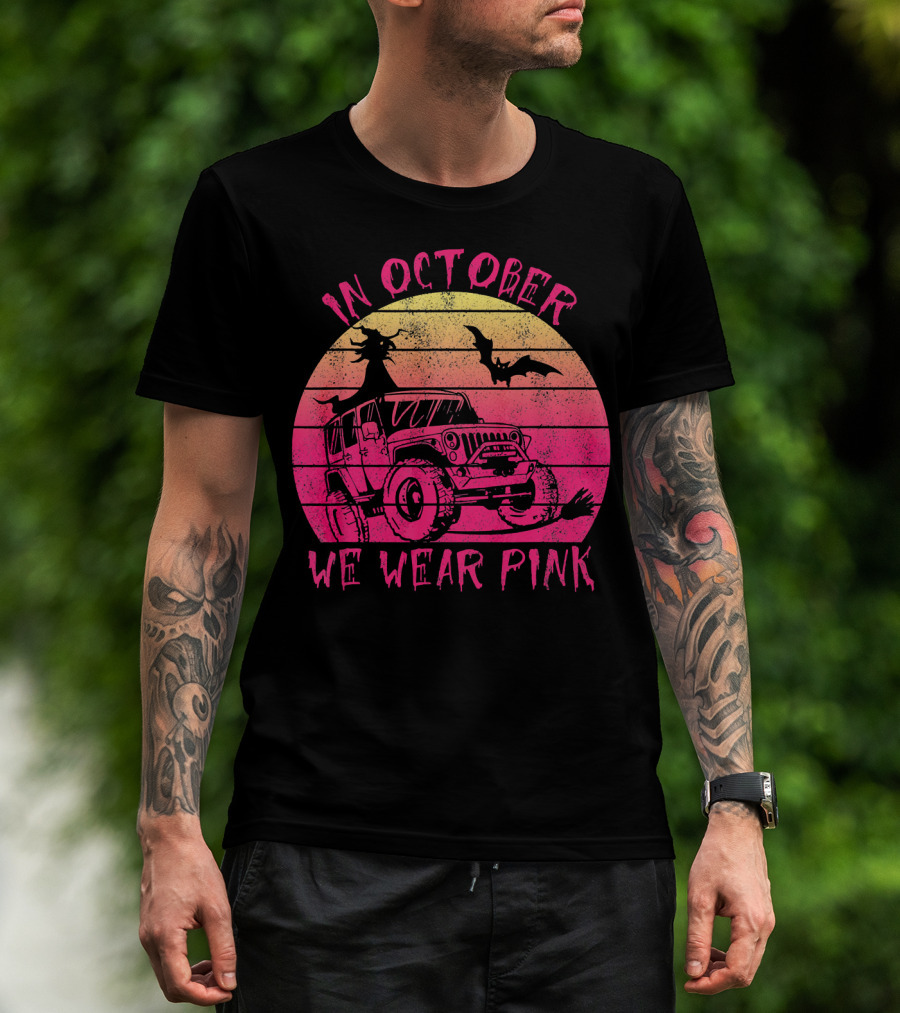 The In October We Wear Pink Halloween Jeeps Witch and Bat Vintage Sunset T-shirt is designed for everyday wear and a consistent fit. Fabric is pre-shrunk ring-spun cotton with durable stitching. See the size chart below for exact measurements.