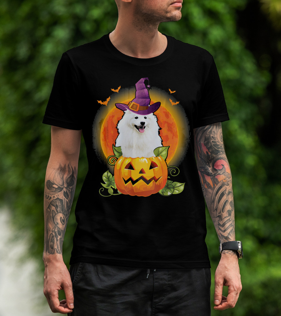 Samoyed Dog Witch Hat Pumpkin Halloween Moon T-Shirt