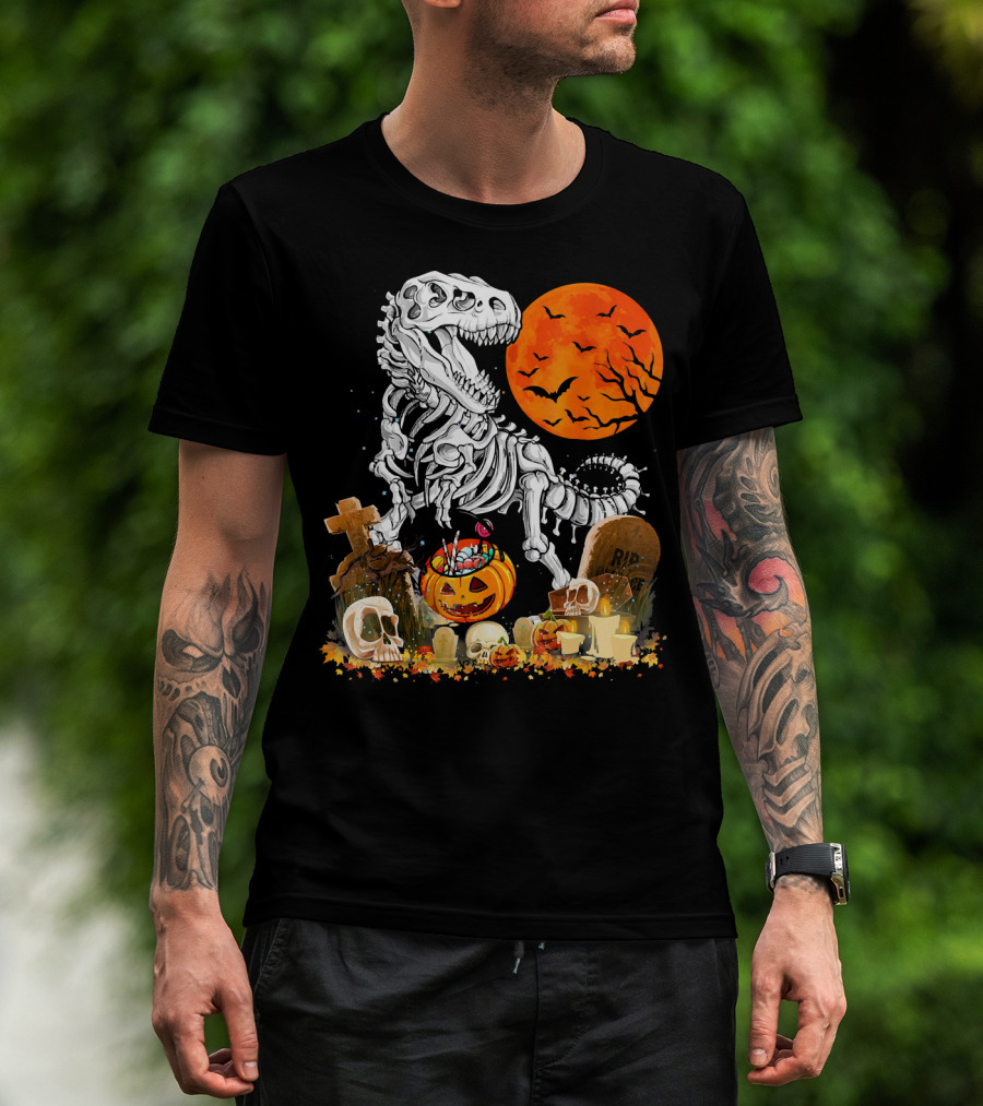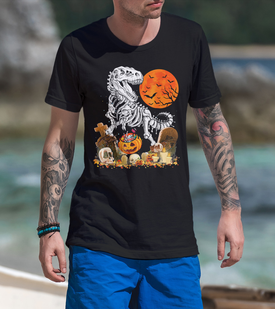 Halloween Dinosaur Rex Skeleton With Pumpkin And Full Moon T-Shirt