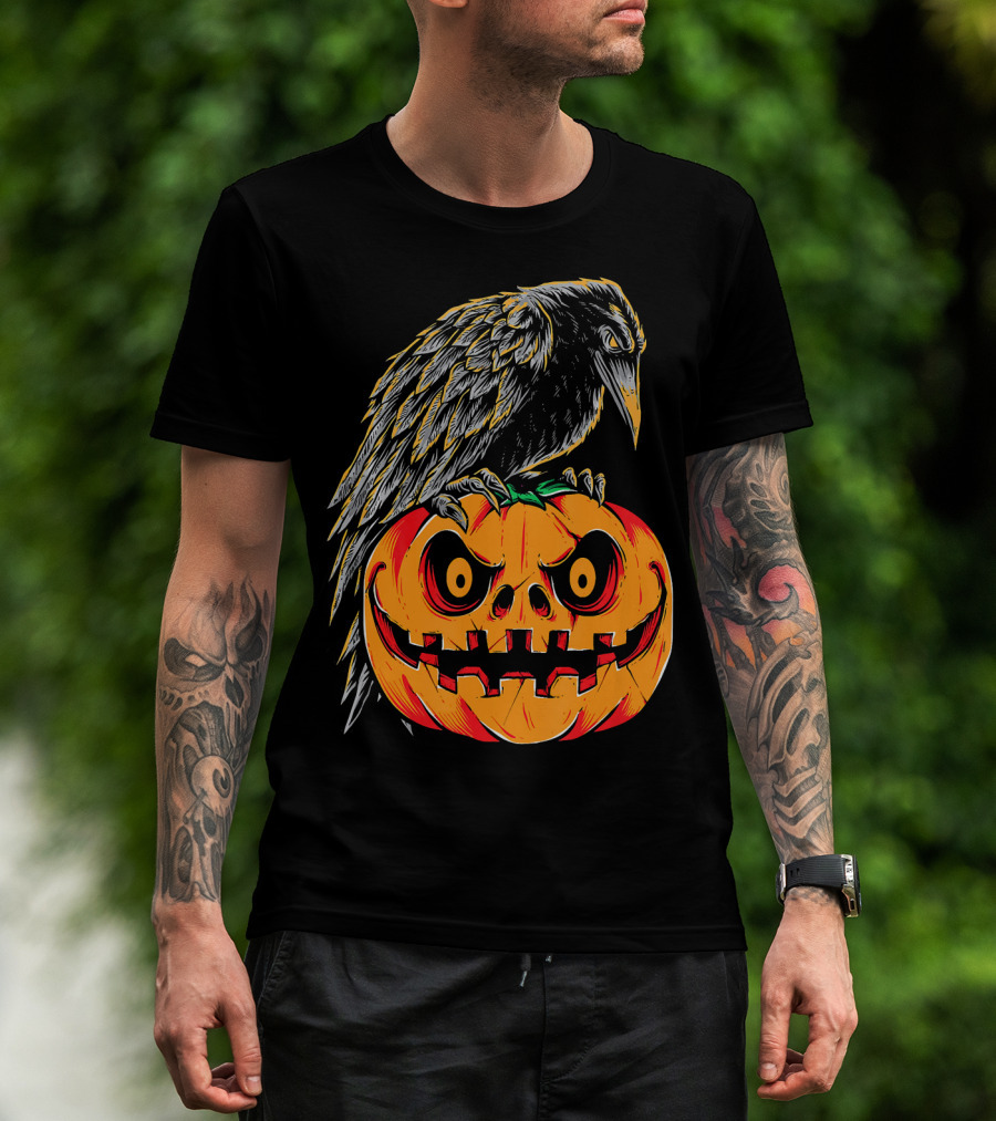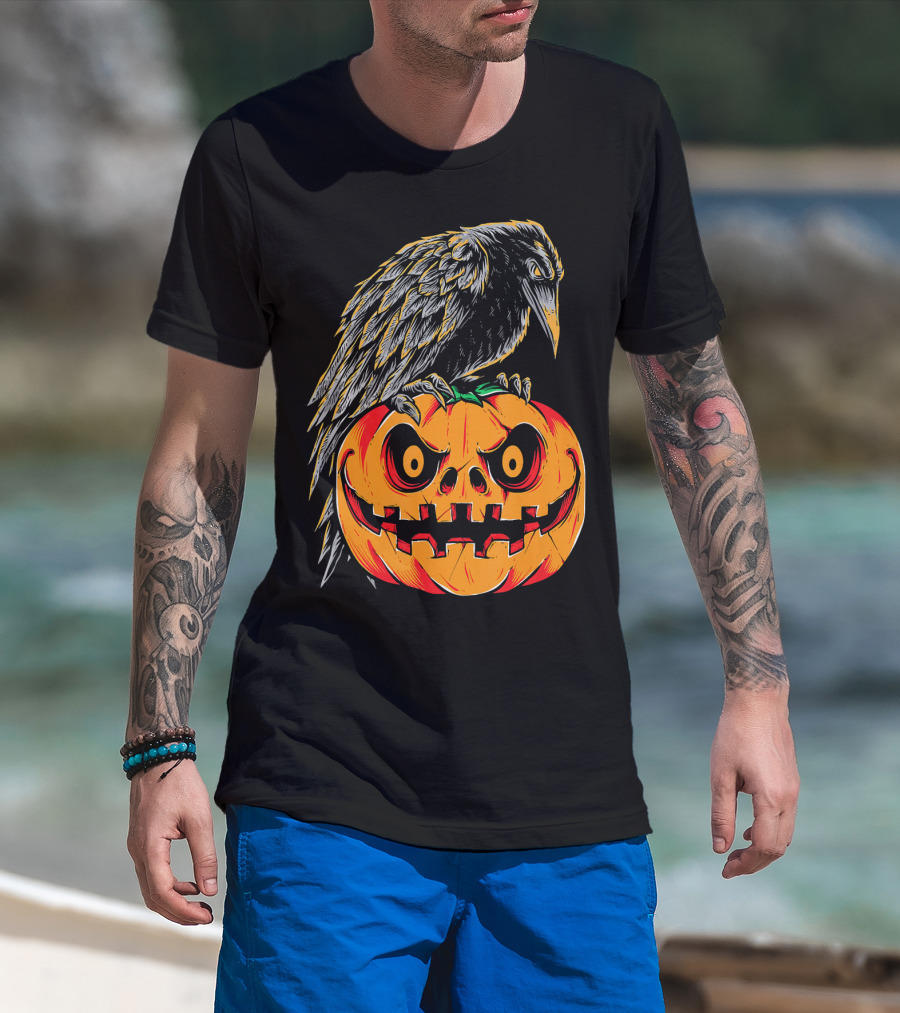 Creepy Black Raven Perched On Retro Vintage Pumpkin Halloween T-Shirt