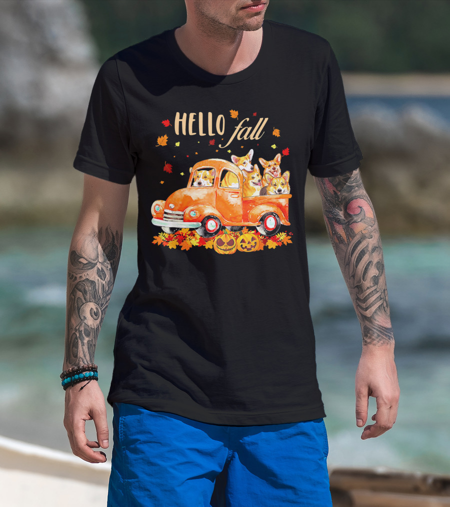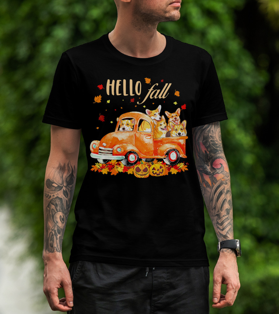 Hello Fall Corgis In Pumpkin Truck With Autumn Leaves And Jack-O'-Lanterns T-Shirt