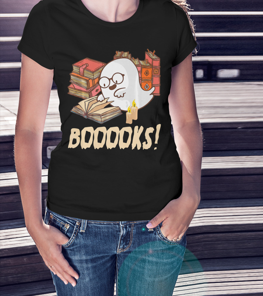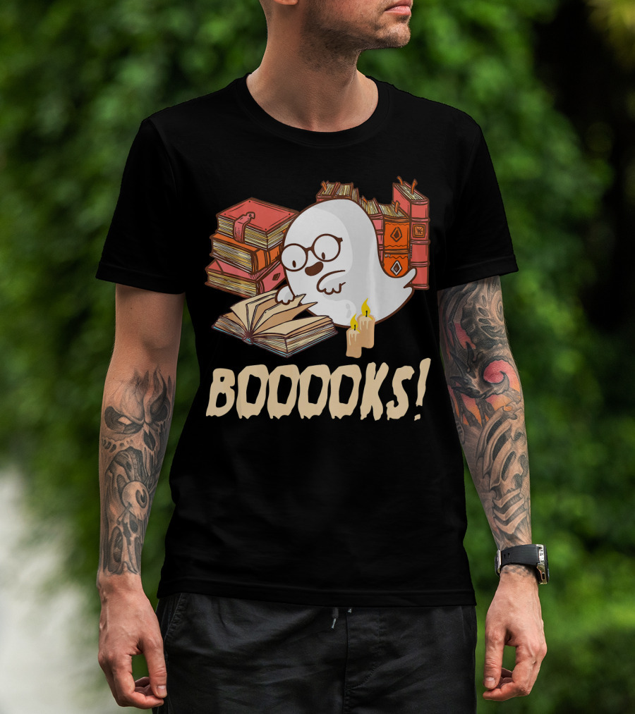 BOOOOKS Cute Reading Boo Ghost With Stacks Of Books And Candles T-Shirt