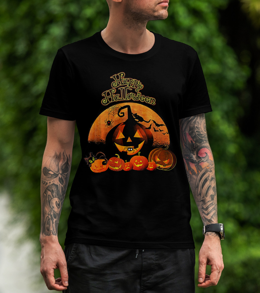 Happy Halloween Pumpkin Black Cat Witch Spider Bats T-Shirt