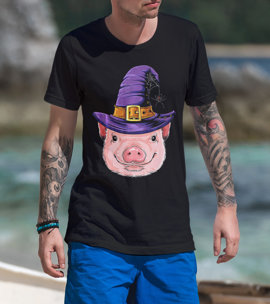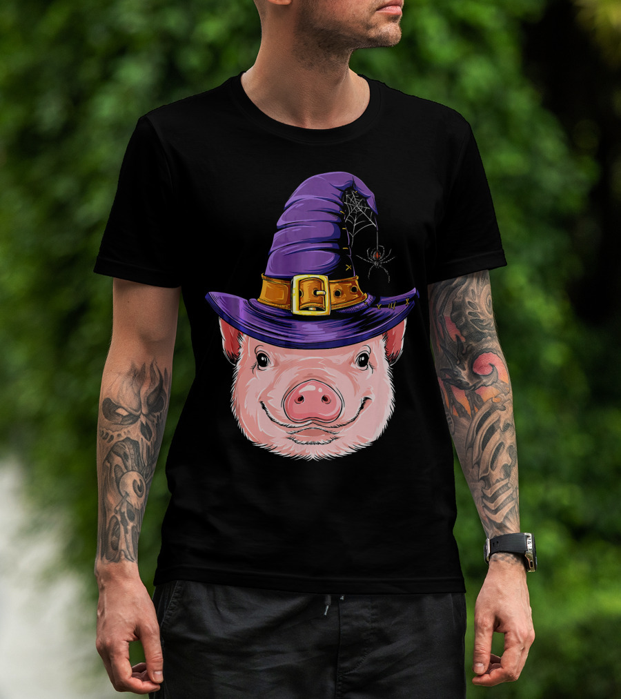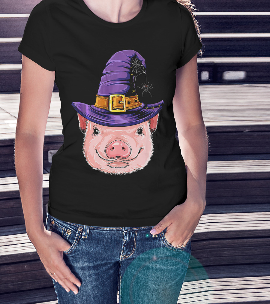 Pig In Witch Hat With Spider And Web Halloween T-Shirt
