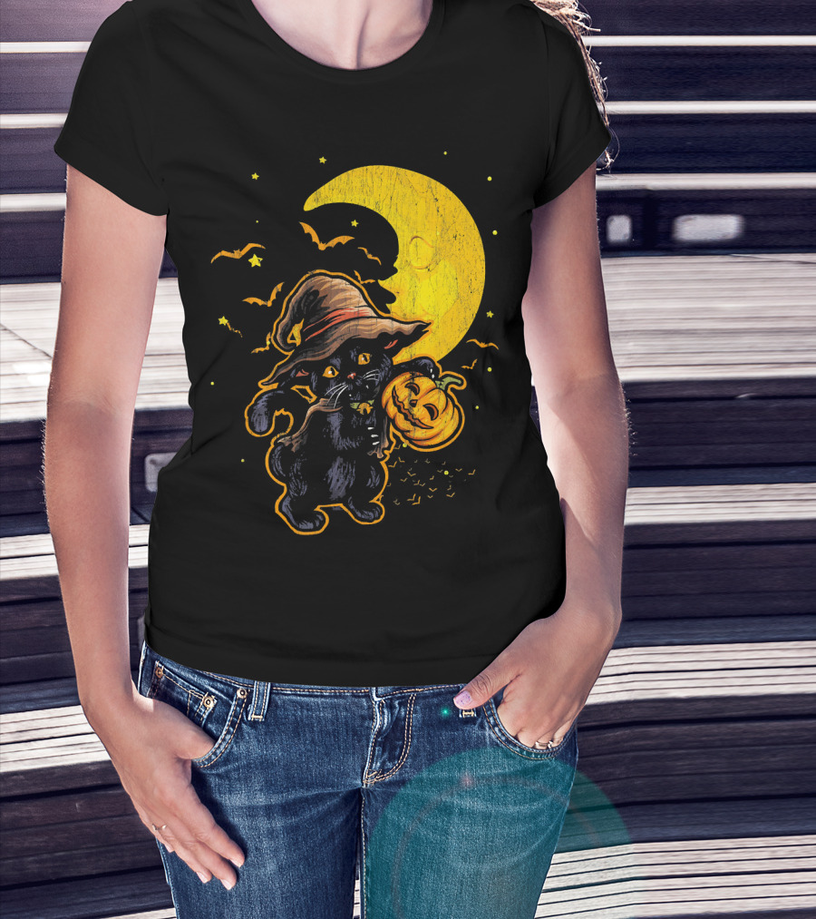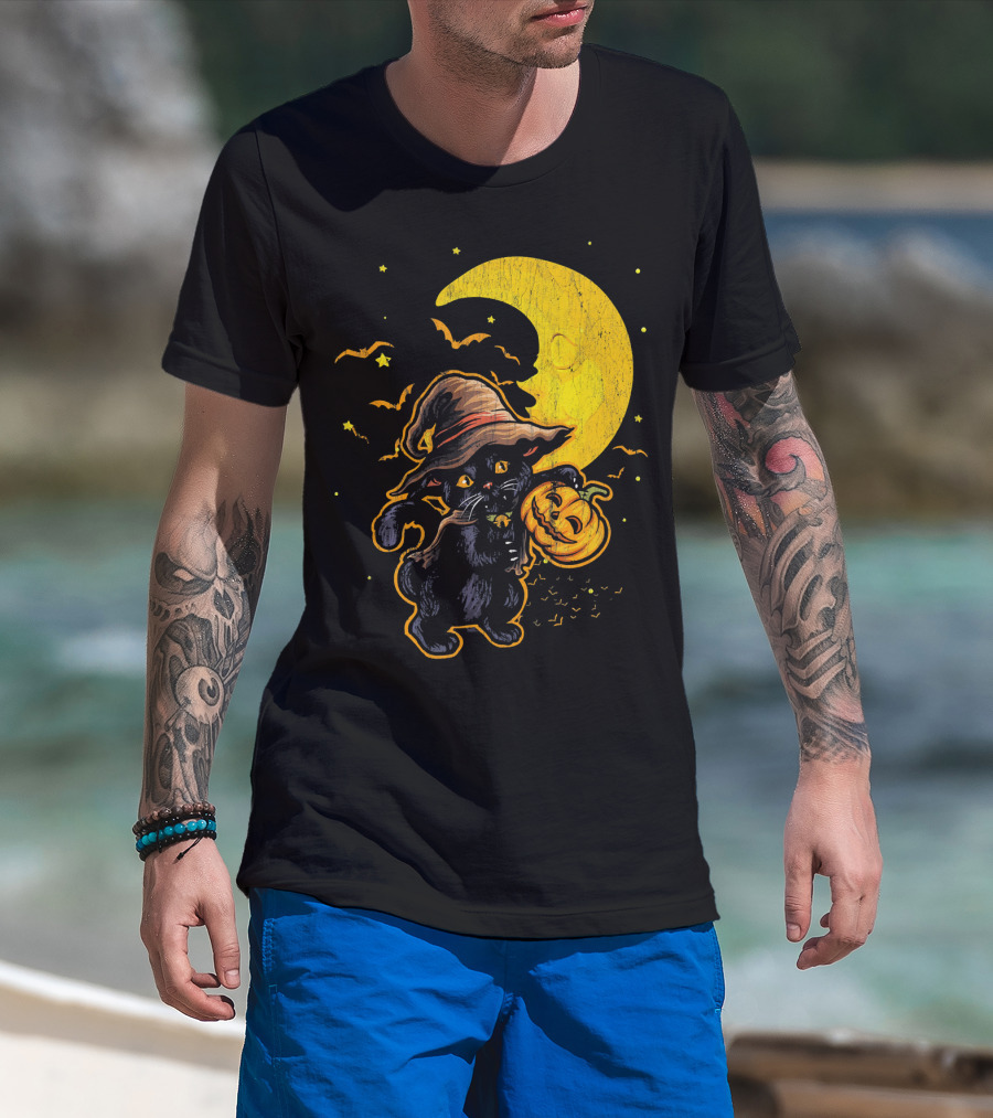 Halloween Black Cat Witch With Pumpkin Under Moon And Bats T-Shirt