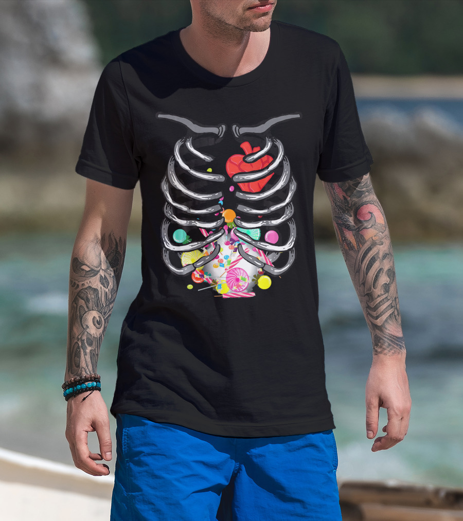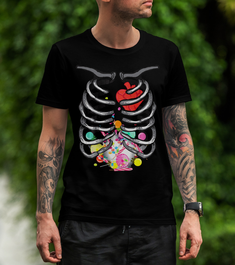 The X Ray Skeleton Candy Heart Guts T-shirt is designed for everyday wear and a consistent fit. Fabric is pre-shrunk ring-spun cotton with durable stitching. See the size chart below for exact measurements.