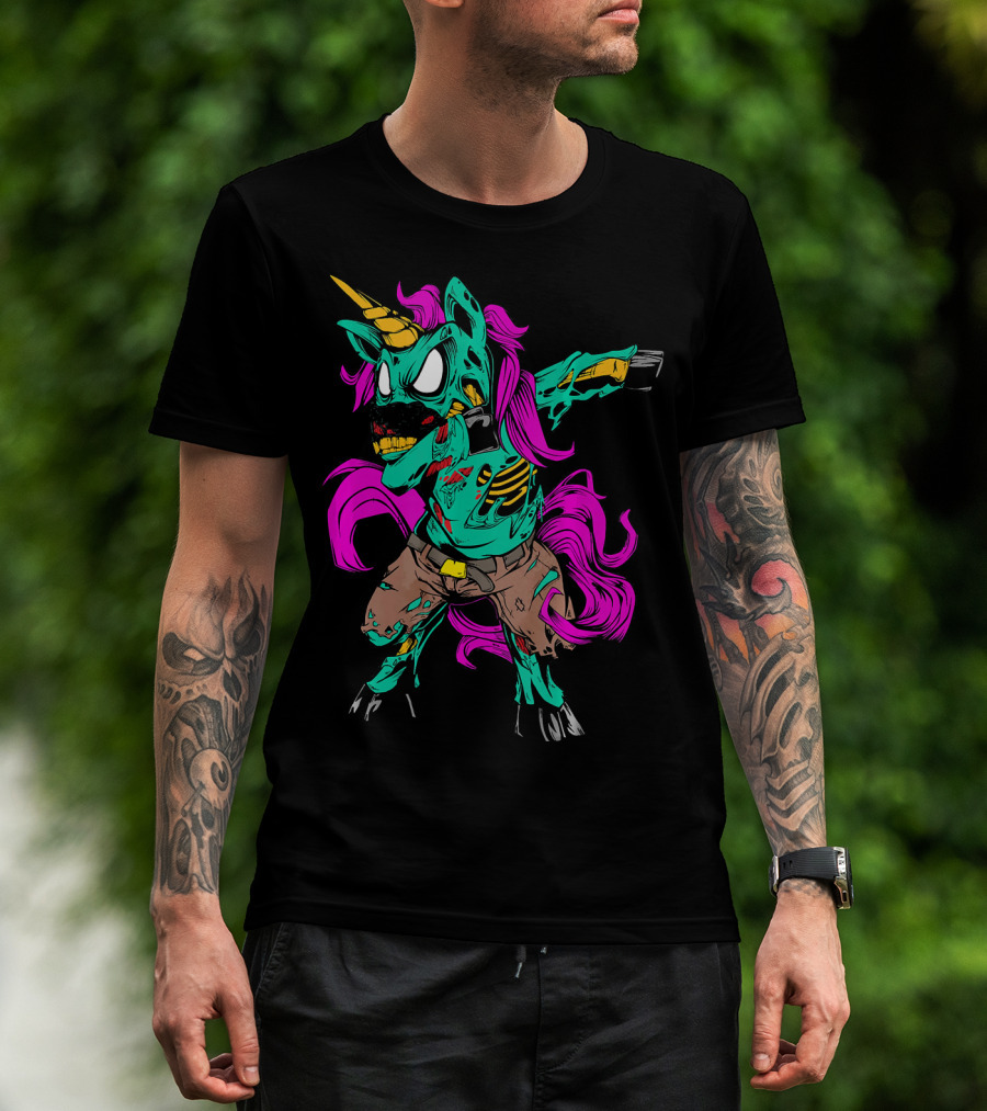 The Scary Dabbing Zombie Unicorn with Pink Mane and Torn Clothing T-shirt is designed for everyday wear and a consistent fit. Fabric is pre-shrunk ring-spun cotton with durable stitching. See the size chart below for exact measurements.