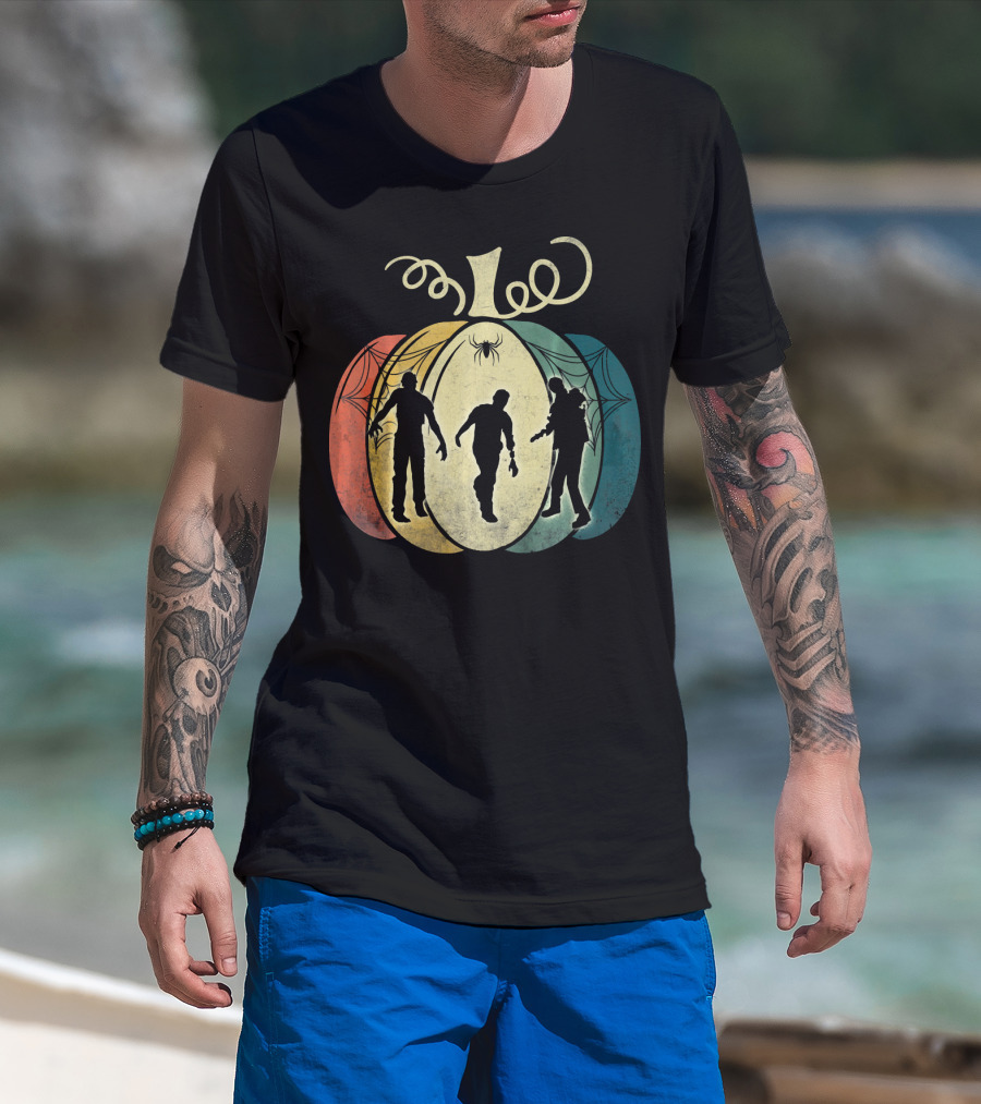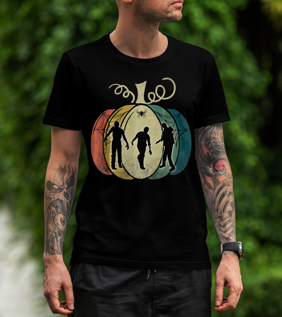 Pumpkin With Zombie Silhouettes And Spider Webs T-Shirt
