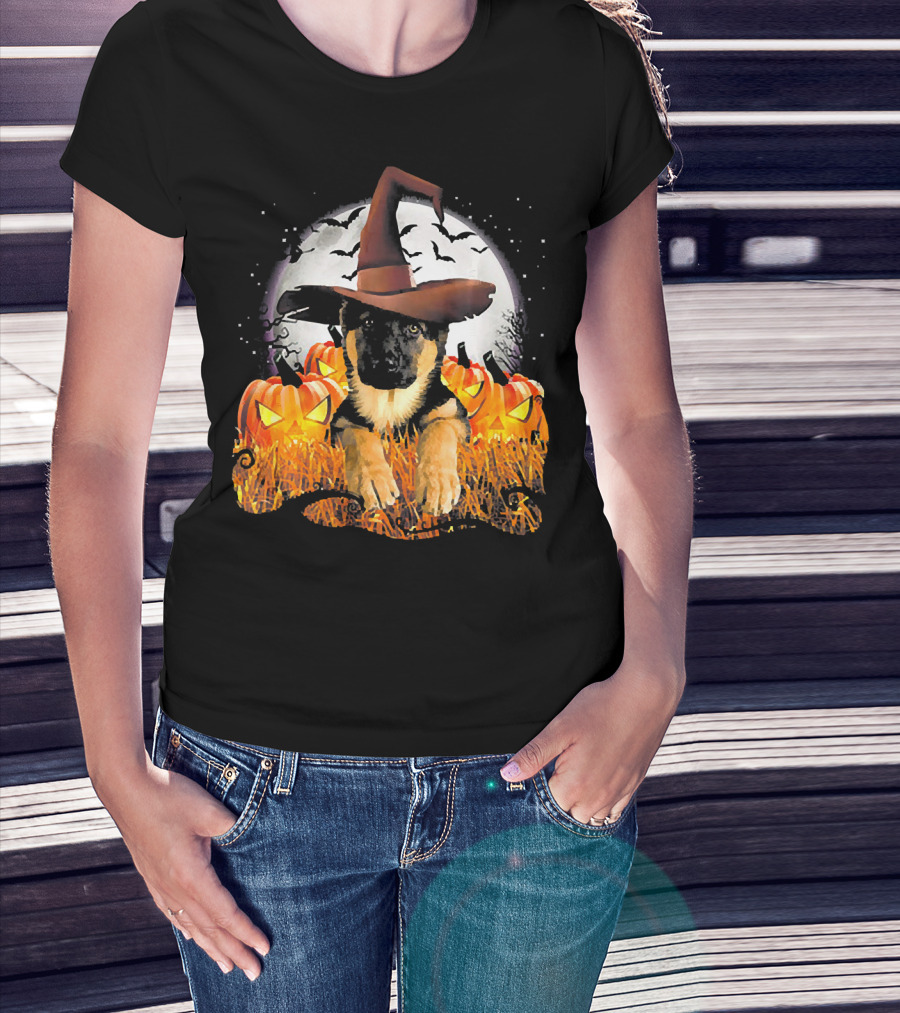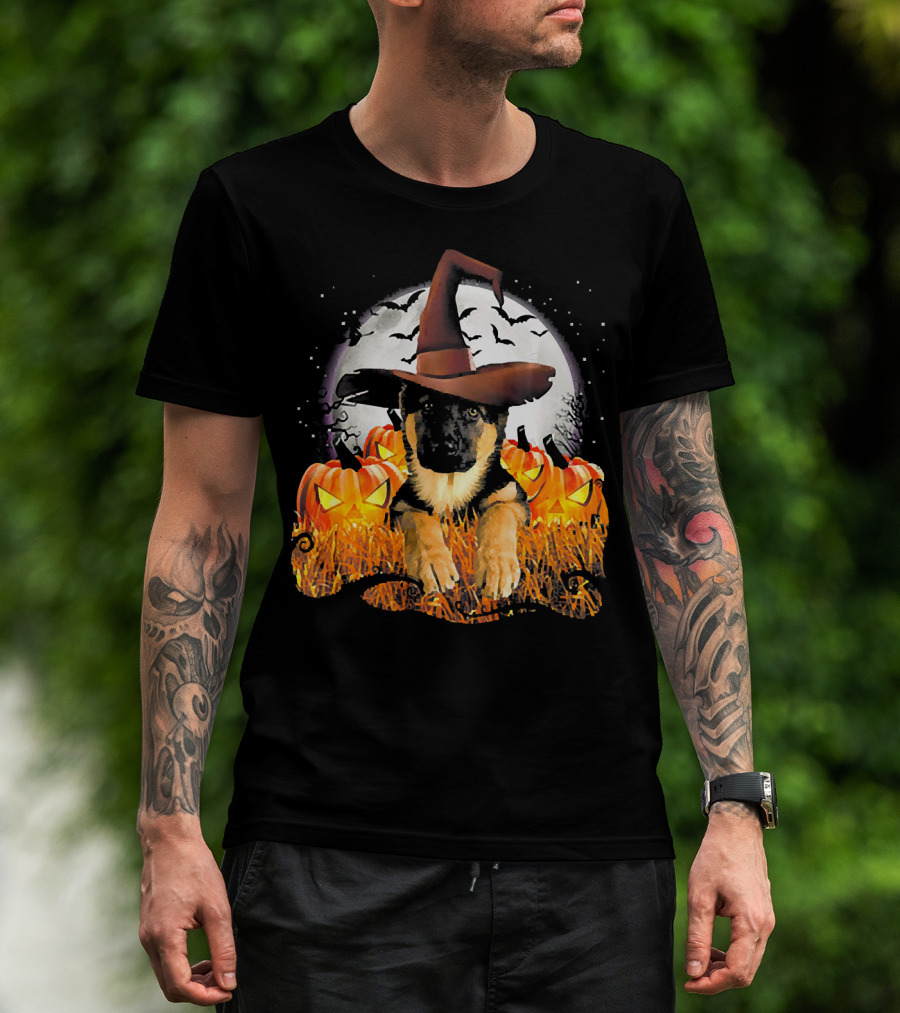 German Shepherd Witch Hat Pumpkins Halloween Moon Bats T-Shirt