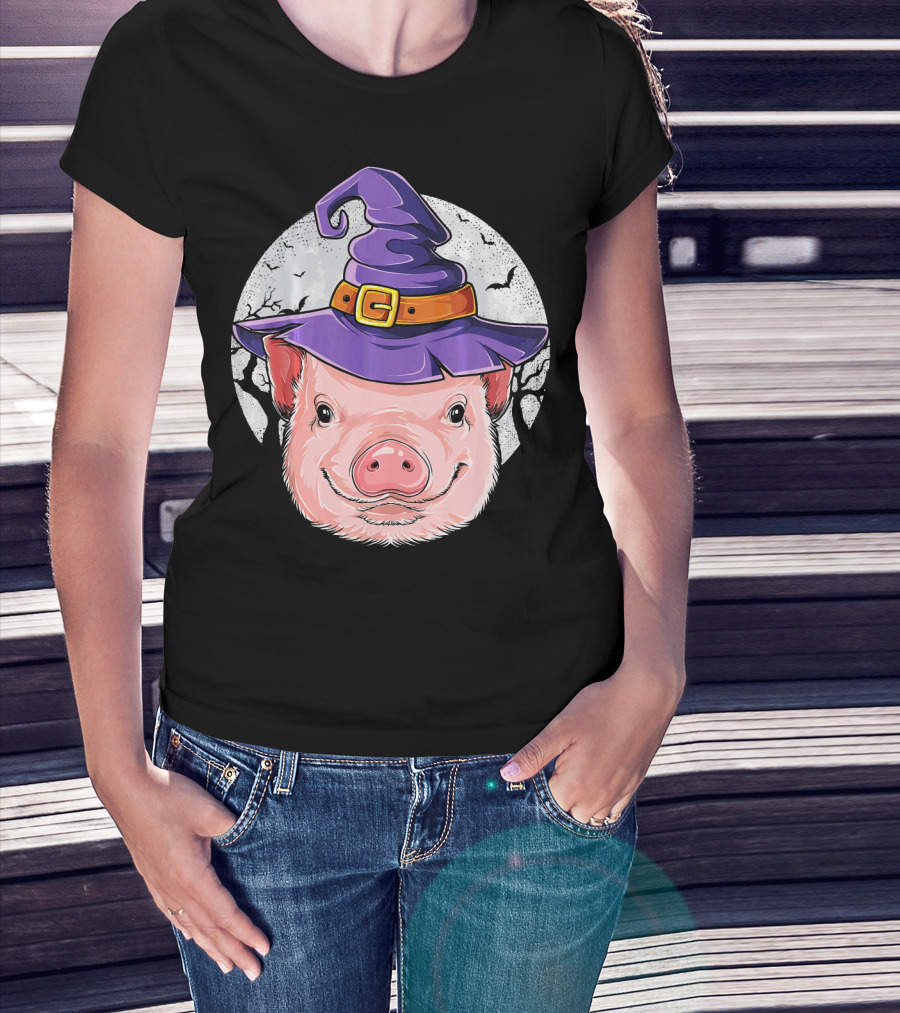 Pig Wearing Purple Witch Hat With Spooky Full Moon And Bats T-Shirt