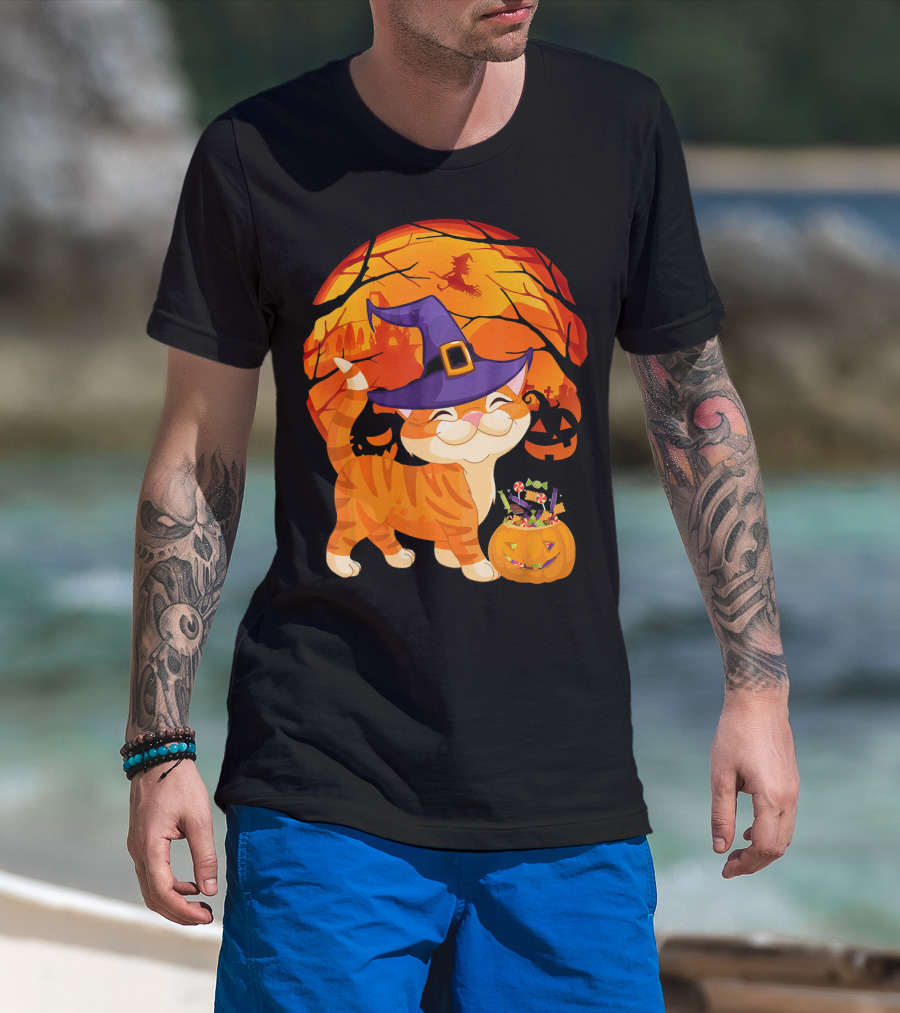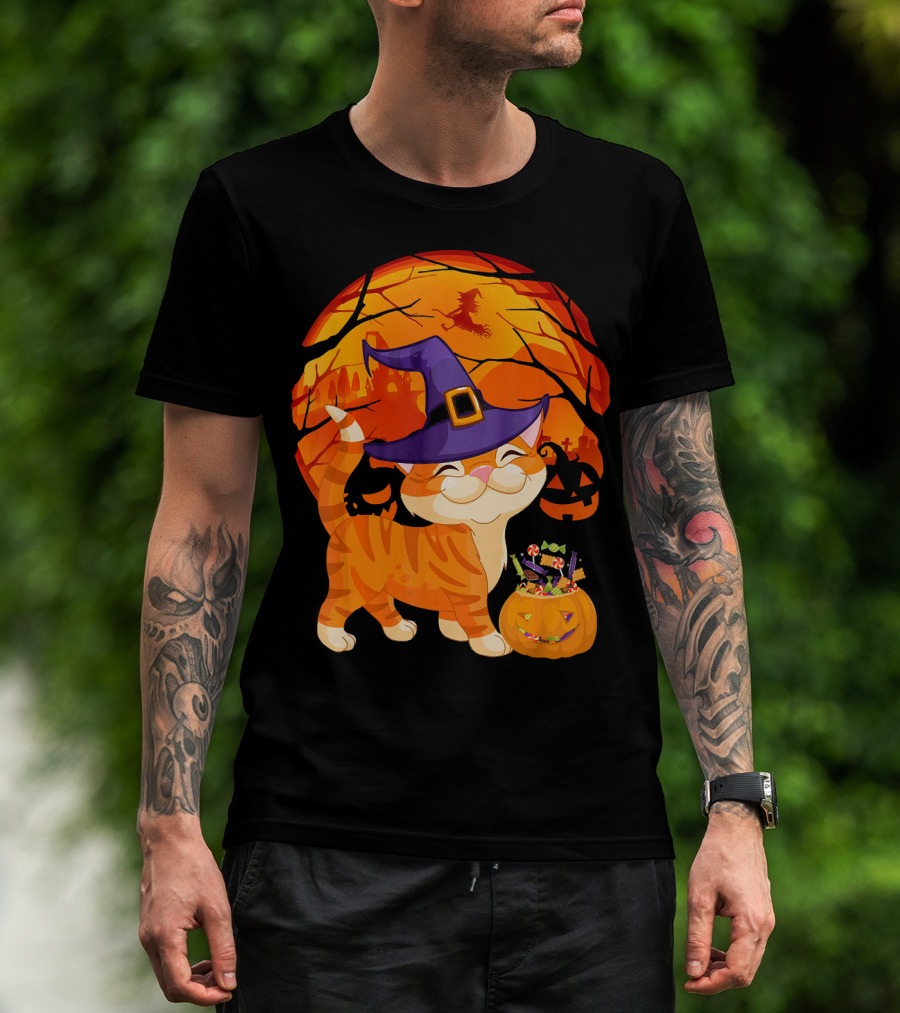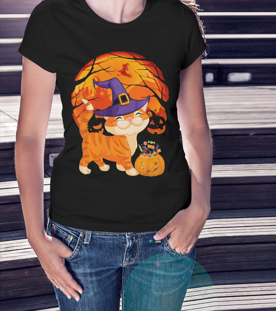 Halloween Costume Cat Witch Hat Happy Pumpkin Moon Scene T-Shirt